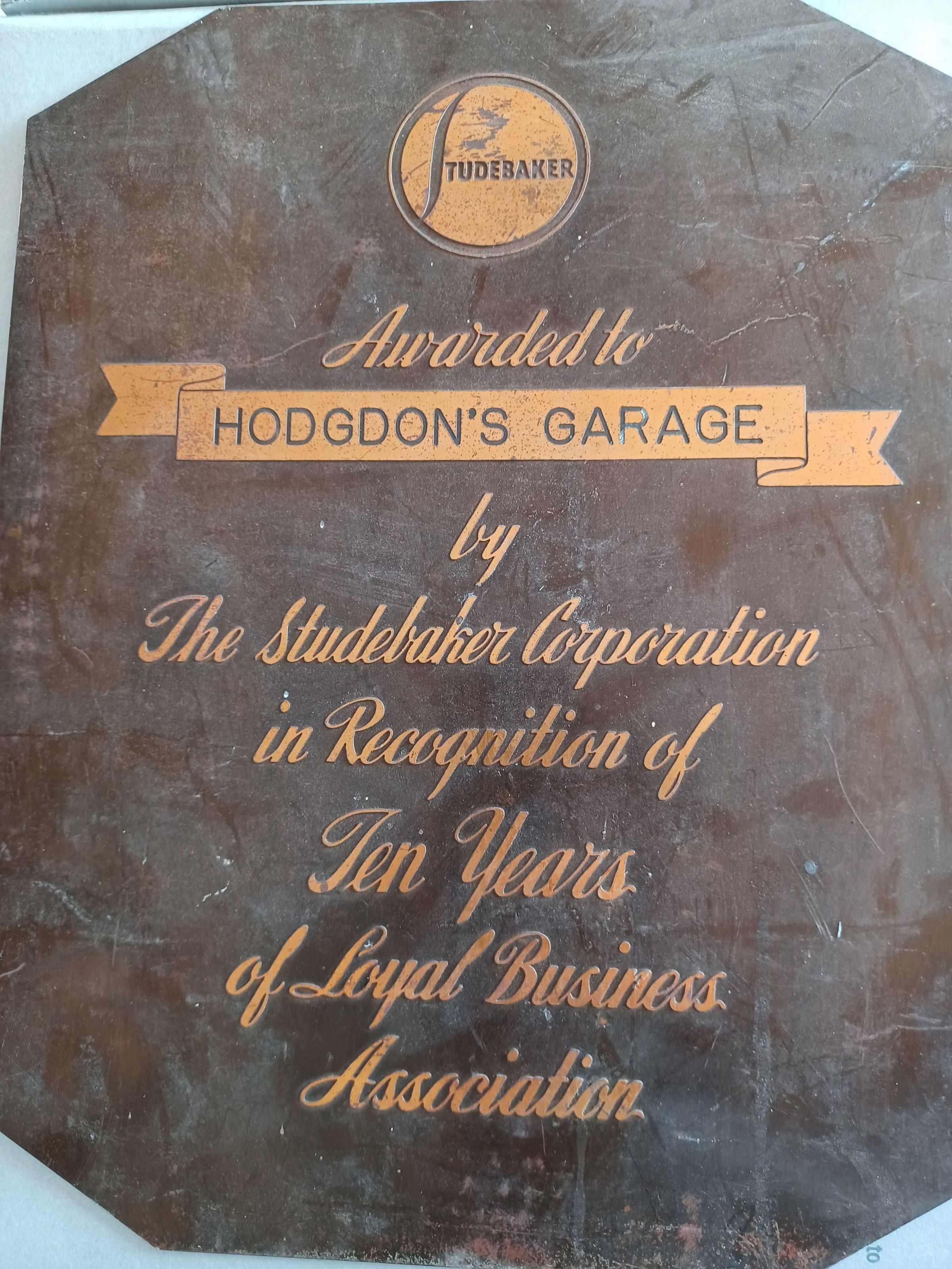 Copper plaque, 11"W x 14"H, given to Hodgon's Garage," In recognition of ten years of loyal business association.Date(s) of Creation