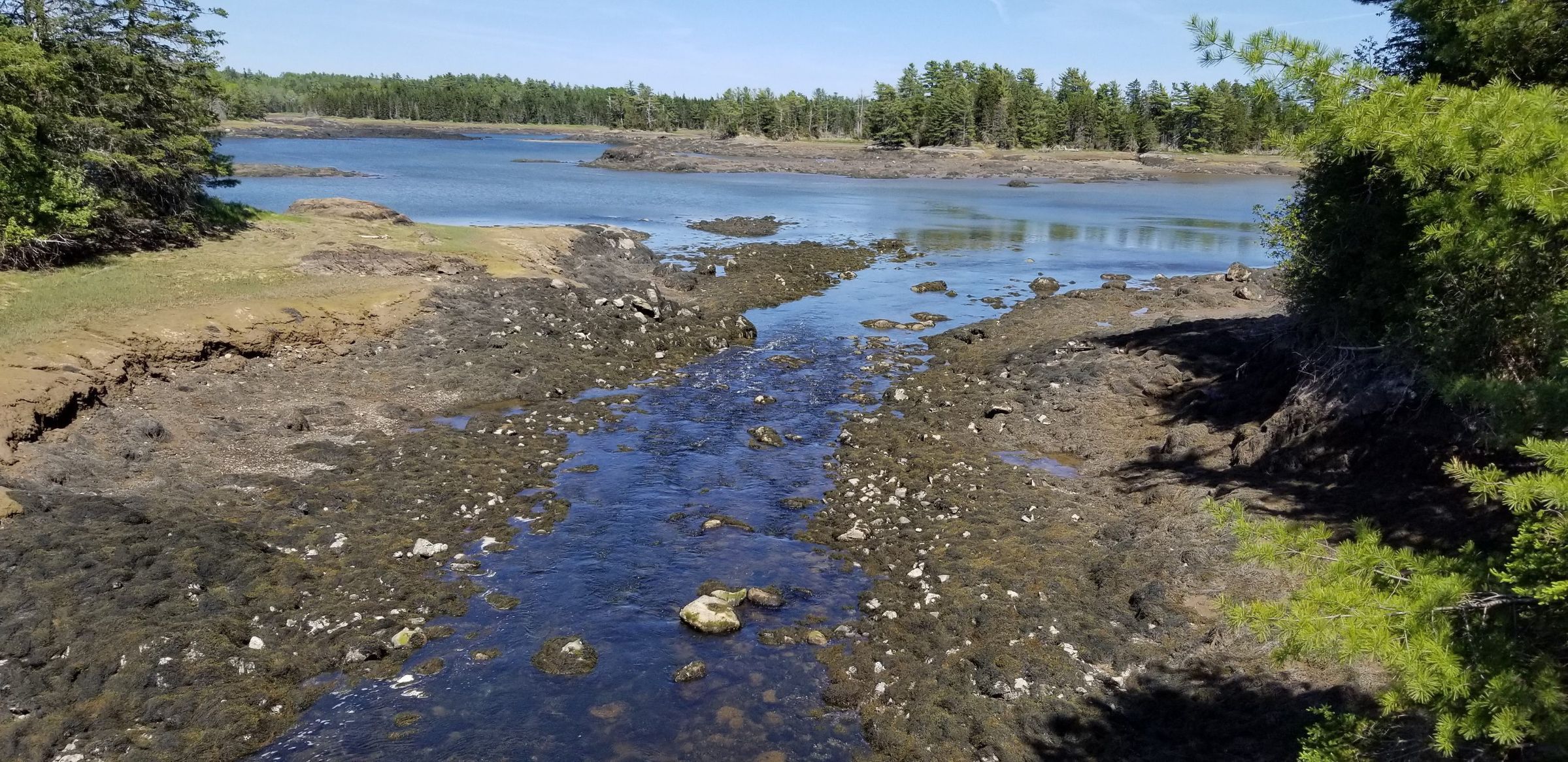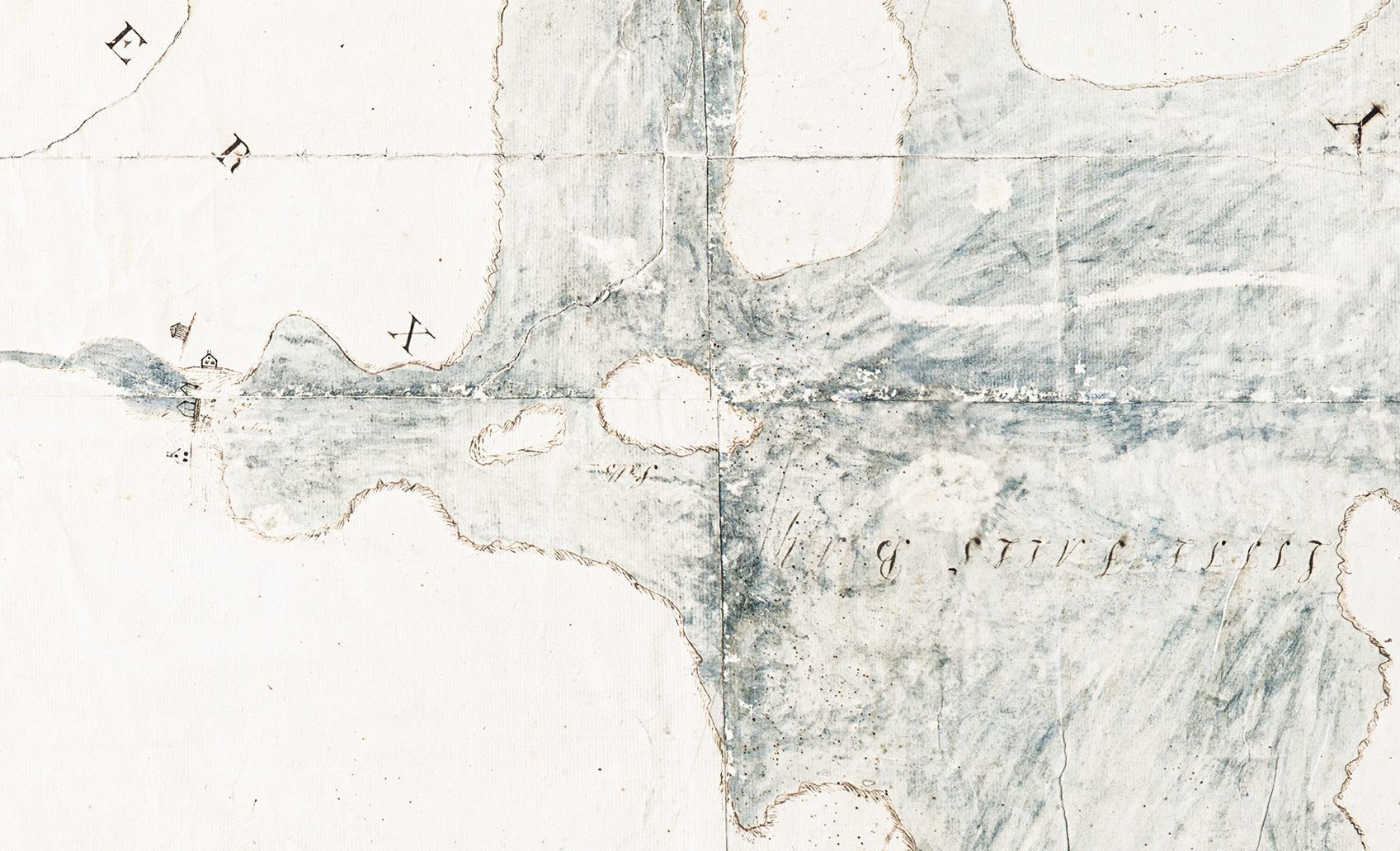 Detail of Solomon Cushing's drawing of Isaac Hobarts house and mills at Little Falls on his combined map of Townships No. 1, 2, and part of 10, made between 1795 and 1800, with a contemporary photograph of the mill stream looking towards the bay at low tide in 2023.Context