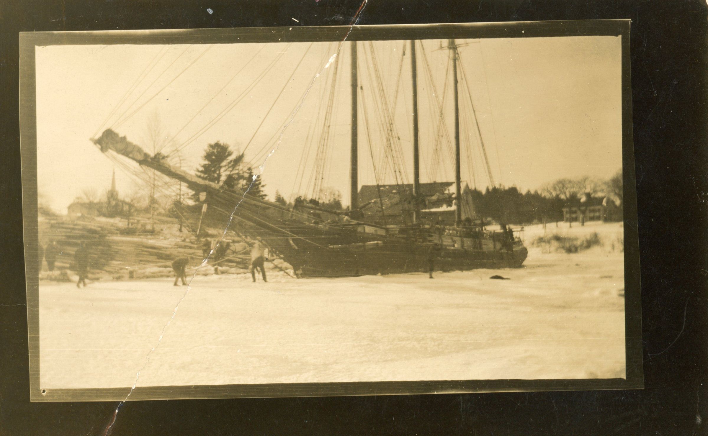 The Jennie French stuck in the ice in front of Allan's Wharf on the Dennys River. This picture was probably taken in the 1890s.Collection