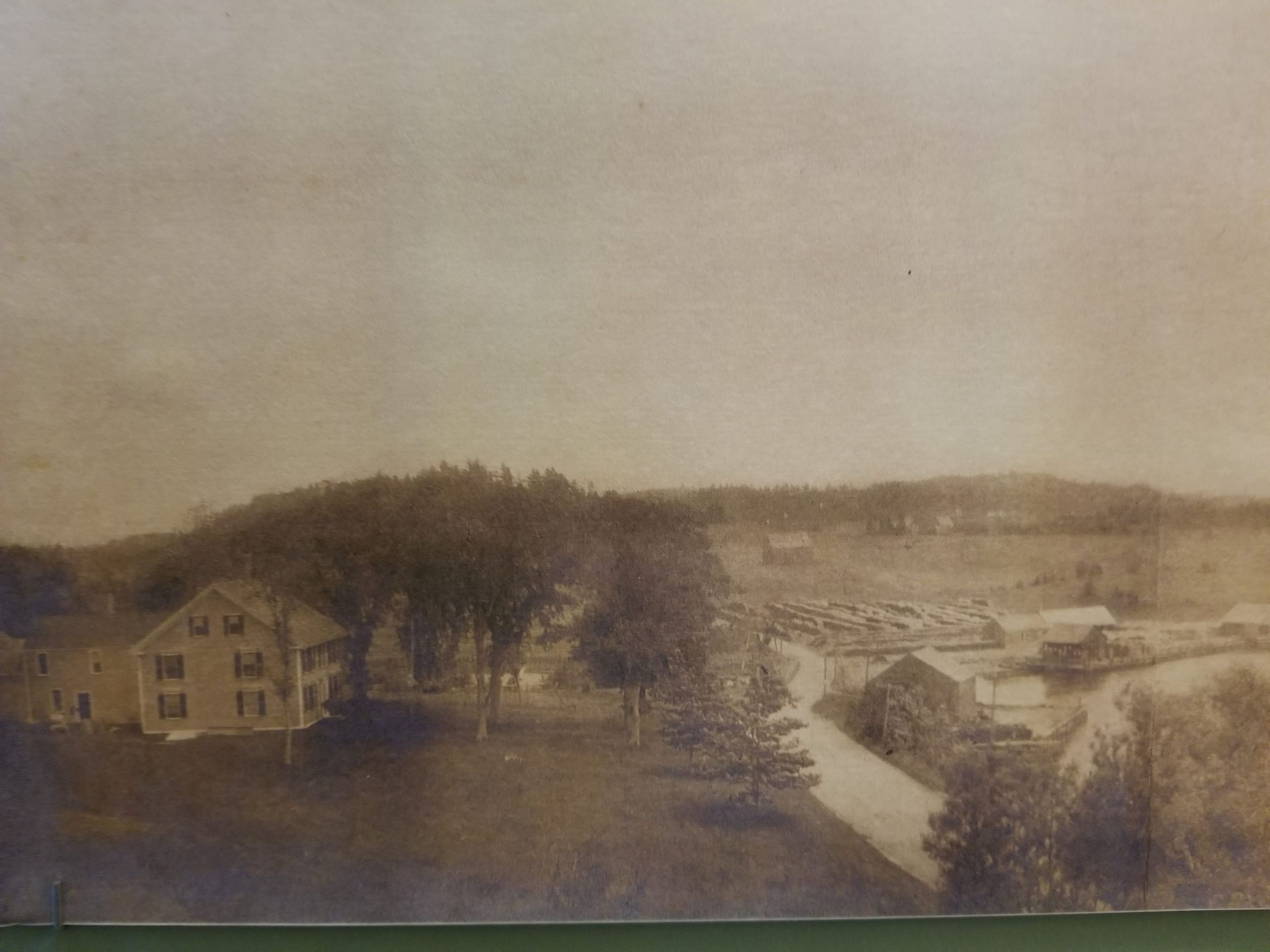 Early photographic view of the Lincoln House in Dennysville, Maine. Visible on either side of Dock Bridge in the center of the picture are the Lincoln wharves, with storehouses and store buildings. Corn Hill is in the background.Collection