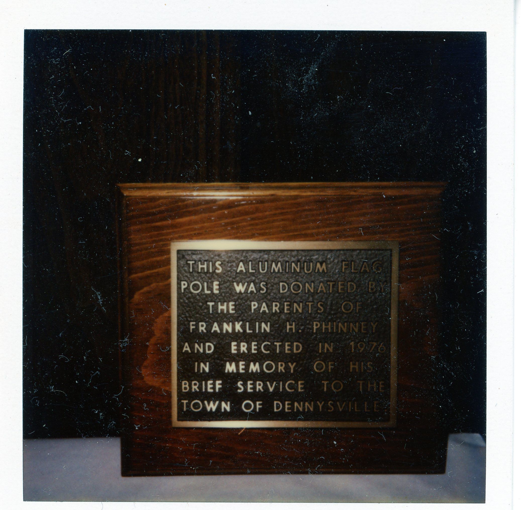 Although records do not indicate by whom the event was sponsored, there was a flag raising on the “Library Green” following the church service on Sunday, May 6, 1917. The same flagpole displayed the fag on that spot until within memory of present senior citizens. In 1976 a metal pole and American flag were erected in the same location by Mr. and Mrs. Donald Phinney in memory of their son, Franklin, who was serving as selectman at the time of his death.