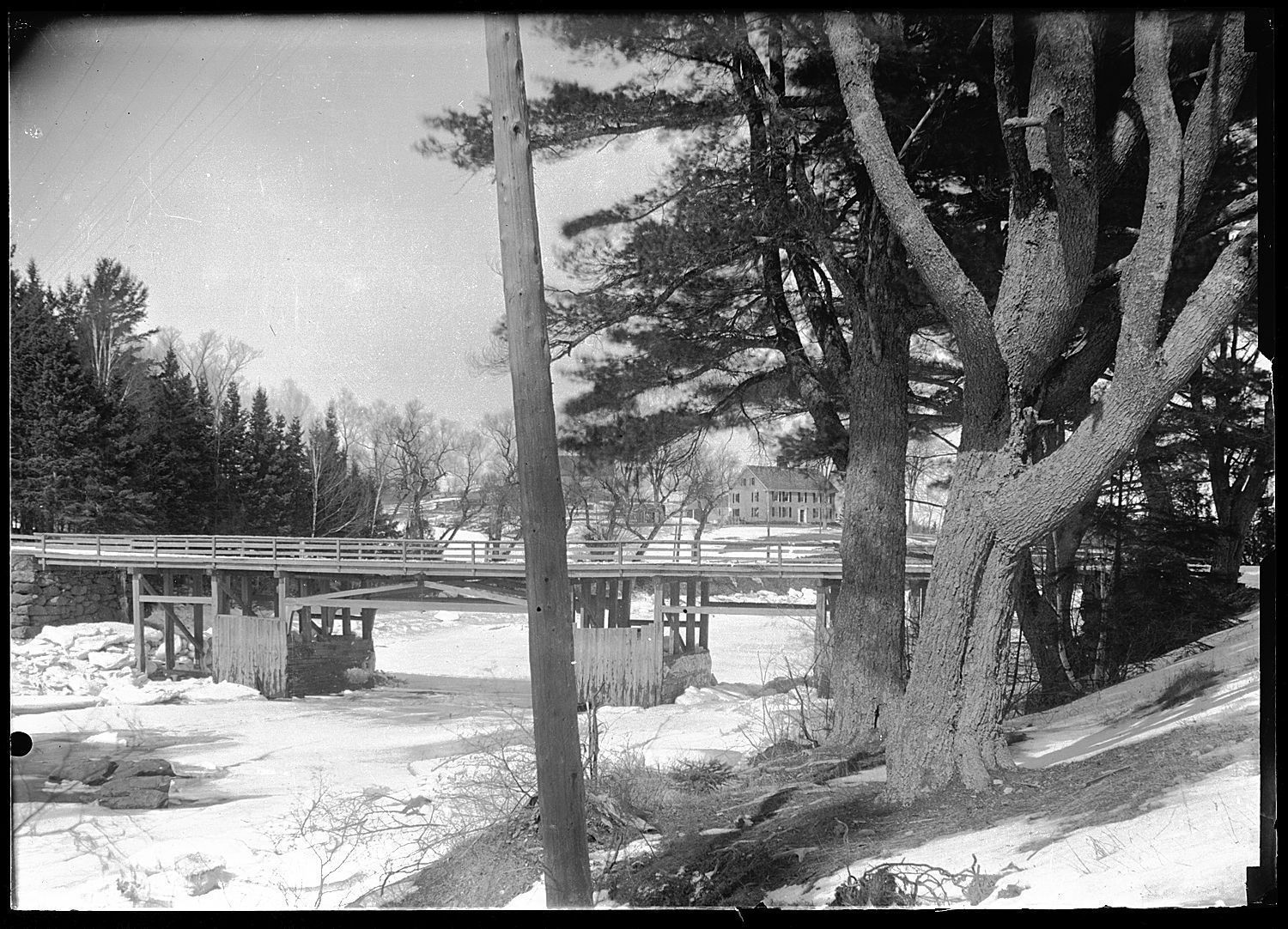 Winter view of the Lower Bridge over the icebound Dennys River as seen from Edmunds, looking towards the Lincoln House in Dennysville. Photograph by John P. Sheahan in the 1880's.Collection