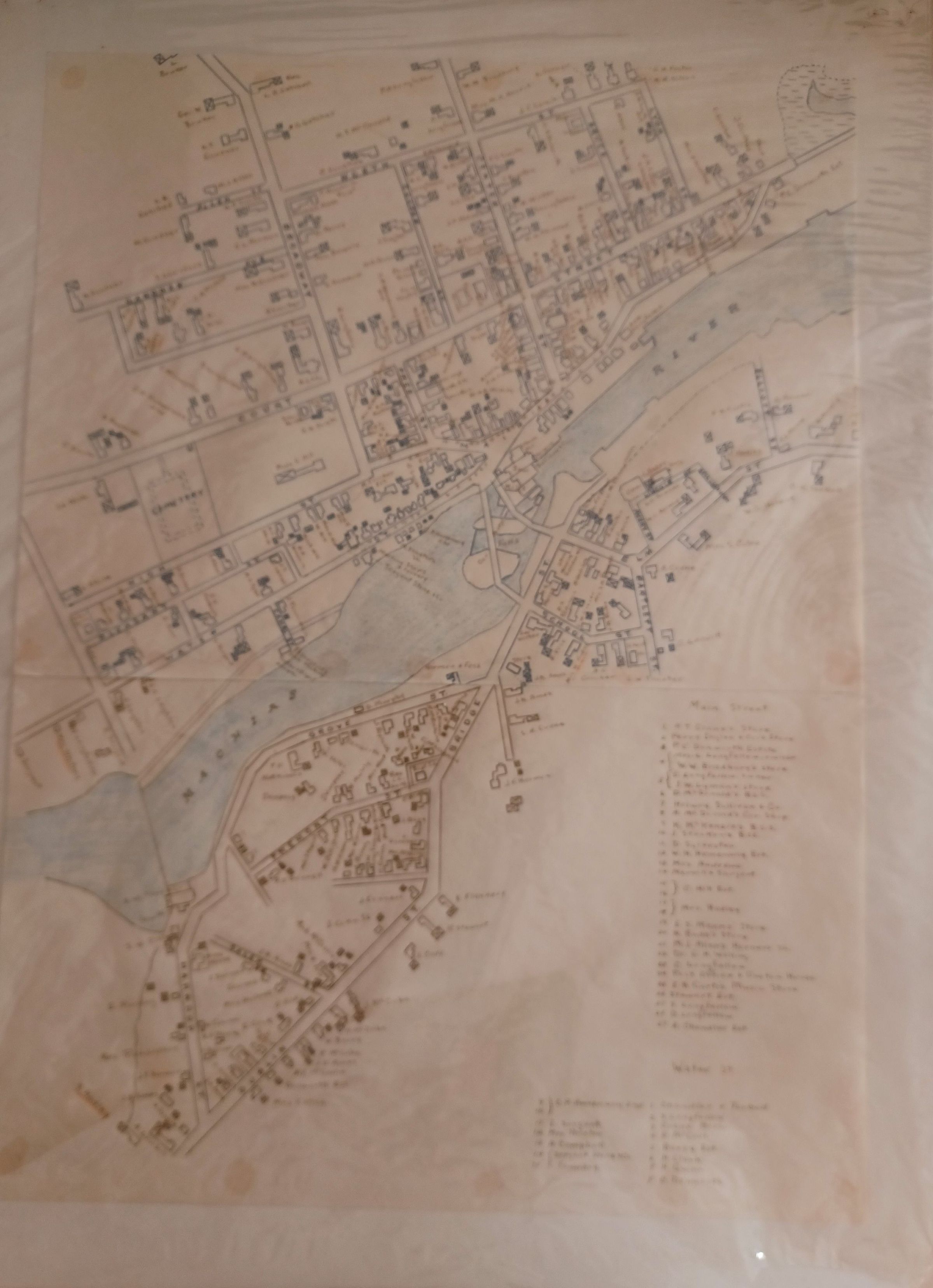 Hand-drawn map of Machias, Maine, showing businesses, homes, and streets in the 2nd half of the 19th century.Collection