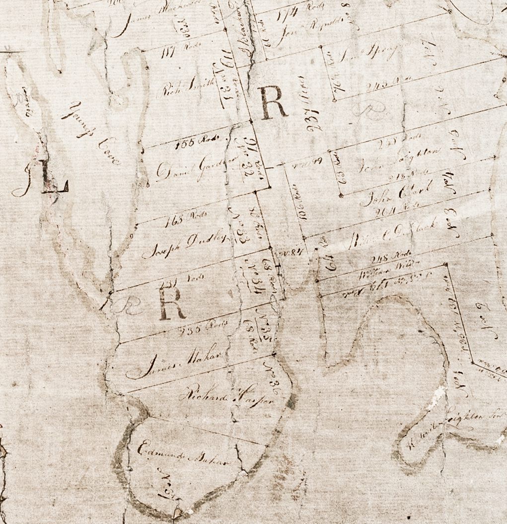 Detail of a map of early settlers at Young's Cove on Leighton's Neck in Township No. 2, now Dennysville and Pembroke, Maine, including the names of Richard Smith, Daniel Gardner, Joseph Dudley, James, Mahar, Richard Harper and Edmund Mahar, and others. A schoolhouse was located at the junction of the Clarkside and Young's Cove Road during the nineteenth and early twentieth centuries.Collection