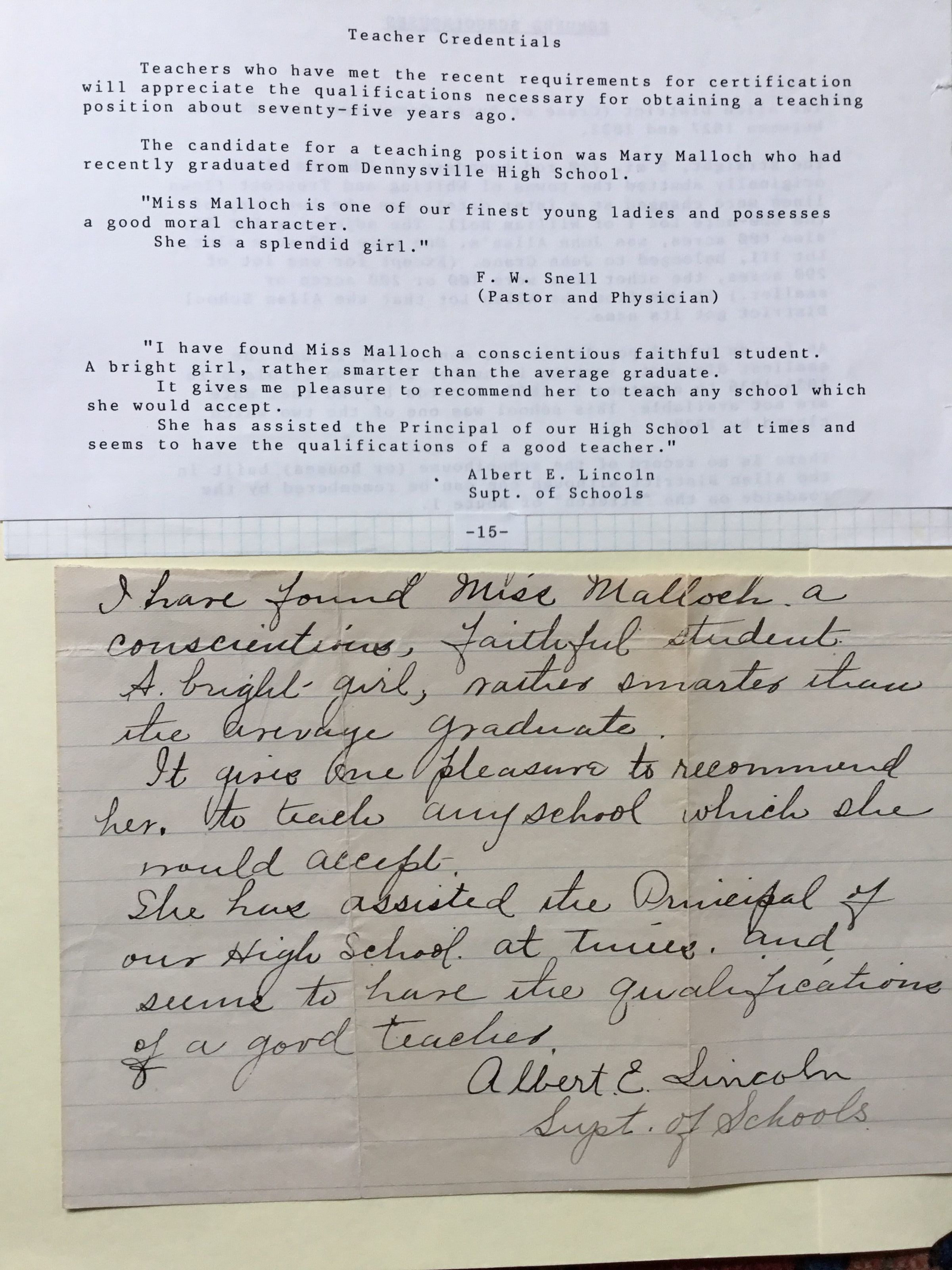 Includes letters of recommendation for "Miss Malloch" as a teacher in the Dennysville schools as well as labels that appear to be detached from photographs of students.Collection