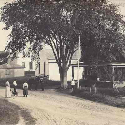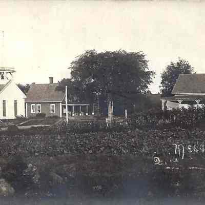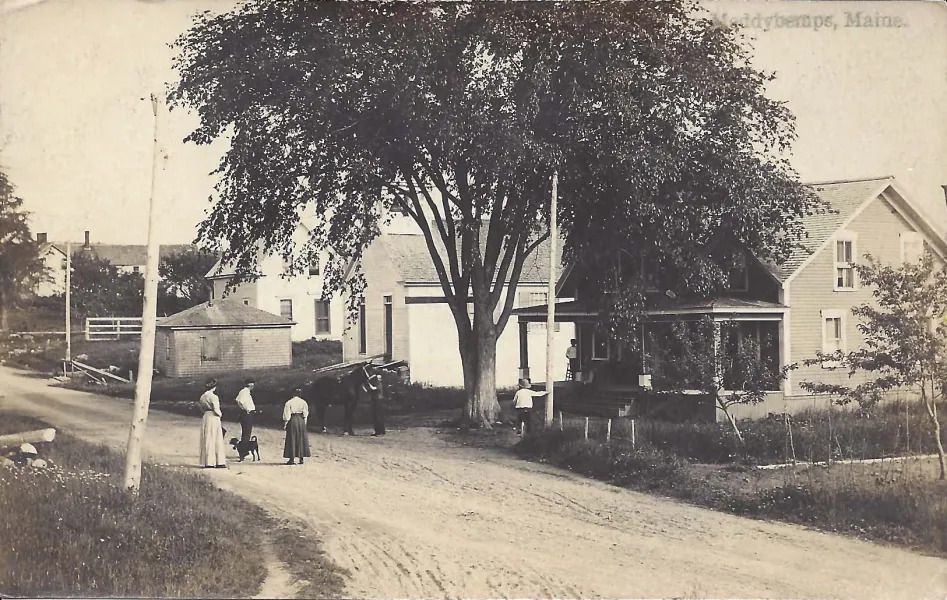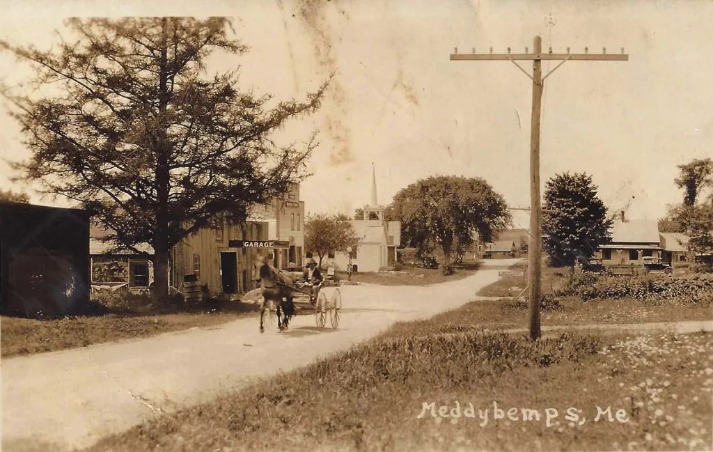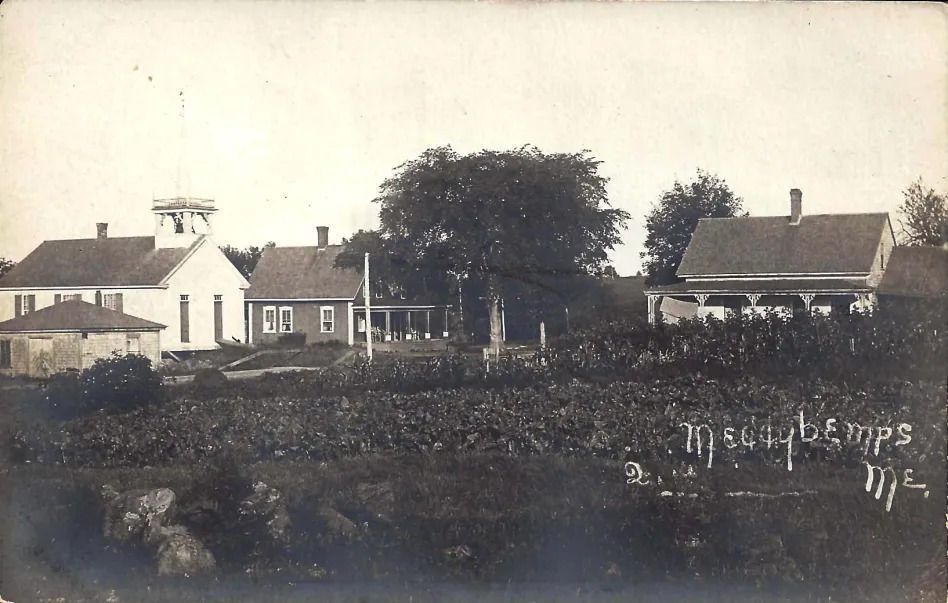 Several postcard views of the village of Meddybemps, Maine, looking along the Main Road through the village, with church building, houses, businesses, and people, taken around 1900.Collection