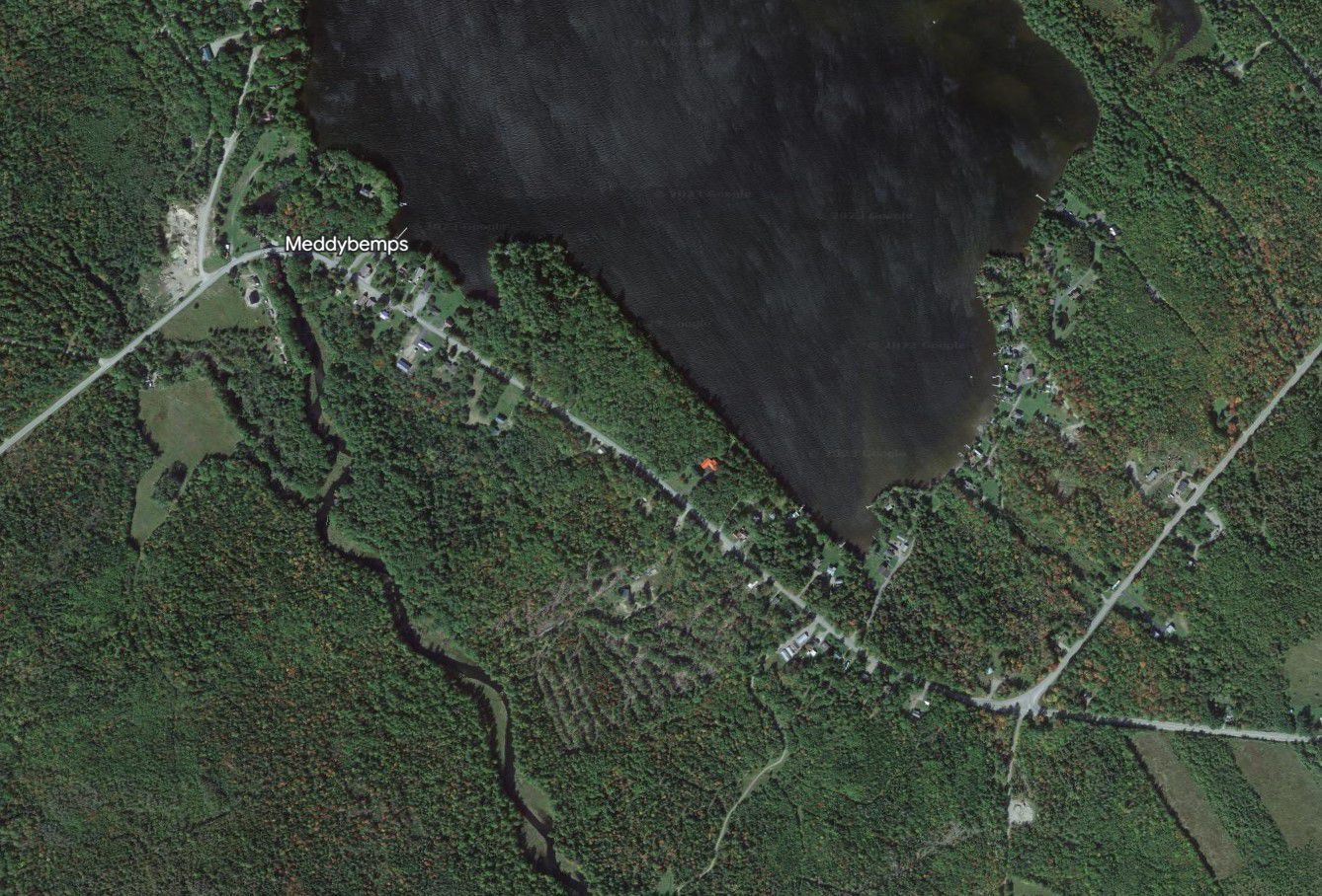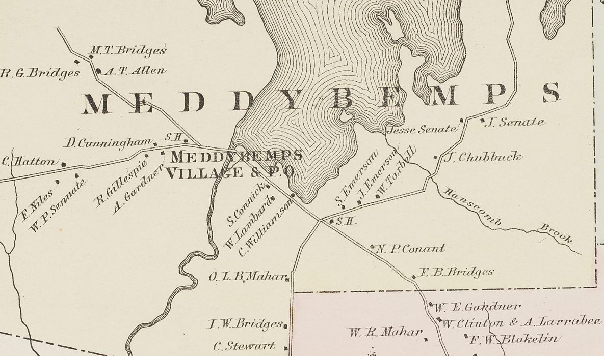 Detail of the Colby Atlas map of Meddybemps, Maine in 1881. Two schoolhouses, marked S.H. are located on either side of the village, where the Dennys River flows south from Meddybemps Lake. A separate map of Meddybemps Village is also published in the Colby Atlas, on p.42,Context