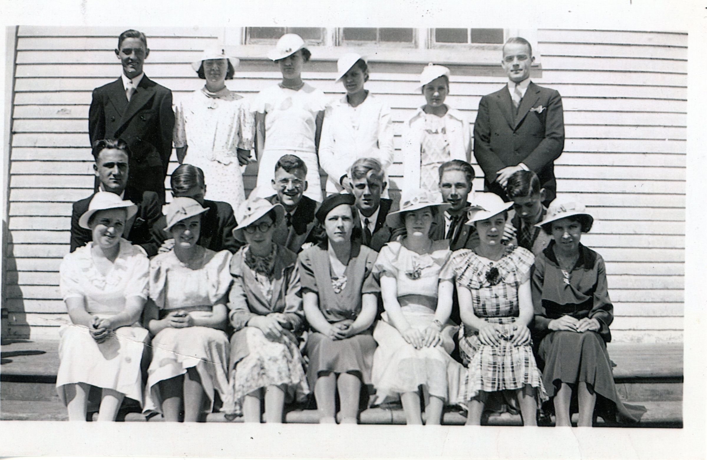 A photograph of Pastor V.E. Johnson's class, on the steps of the Dennysville Congregational Church, 1936.