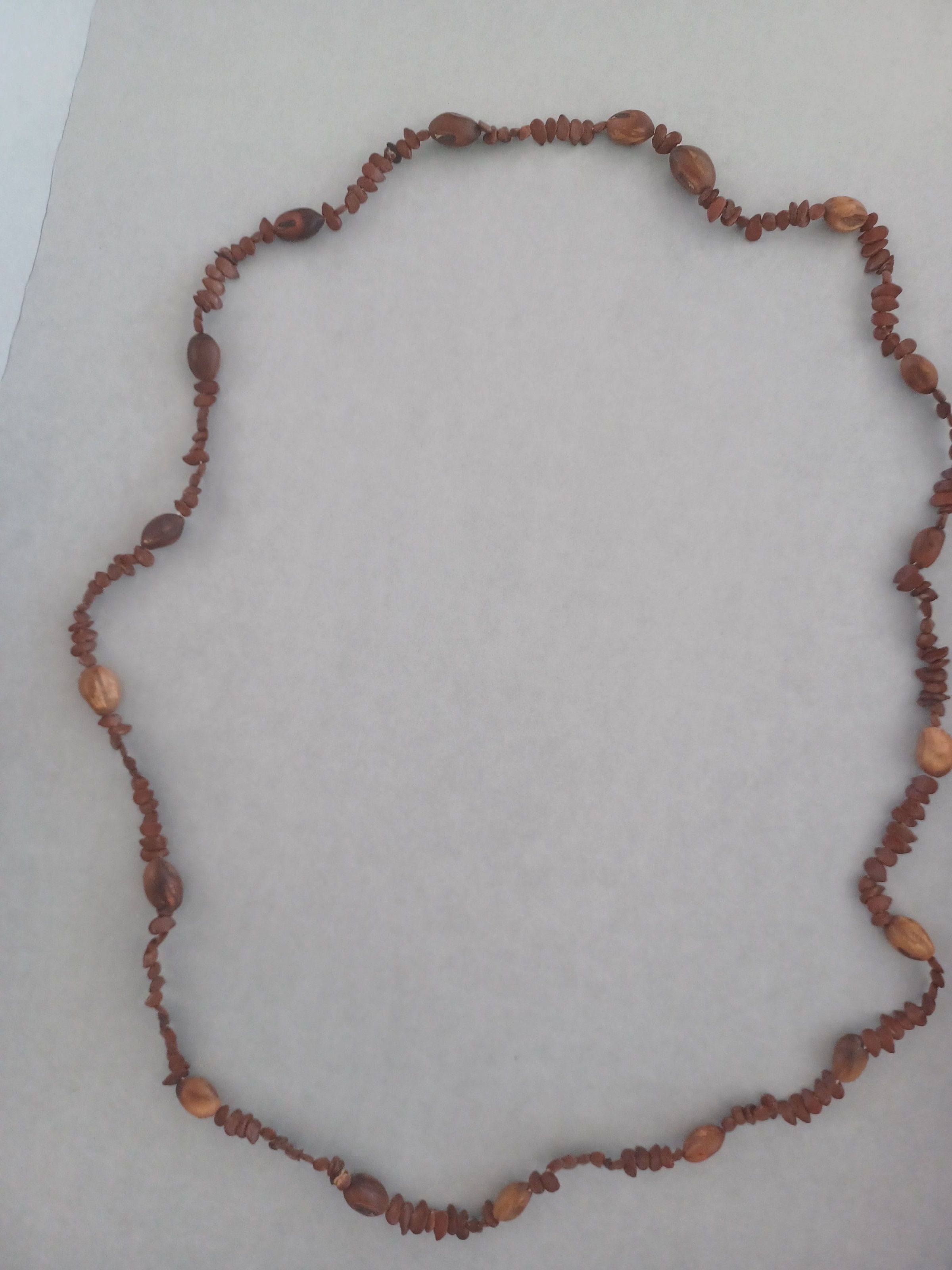 A hand-sewn, child size brown cotton dress with leather fringes on the sleeves and hem. There is a hand-embroidered emblem on the left breast. The neckline is flat with a lace-up front declivity. It appears to be an interpretive costume of Native American culture. Included is a necklace of natural seeds and nuts.Made/Created