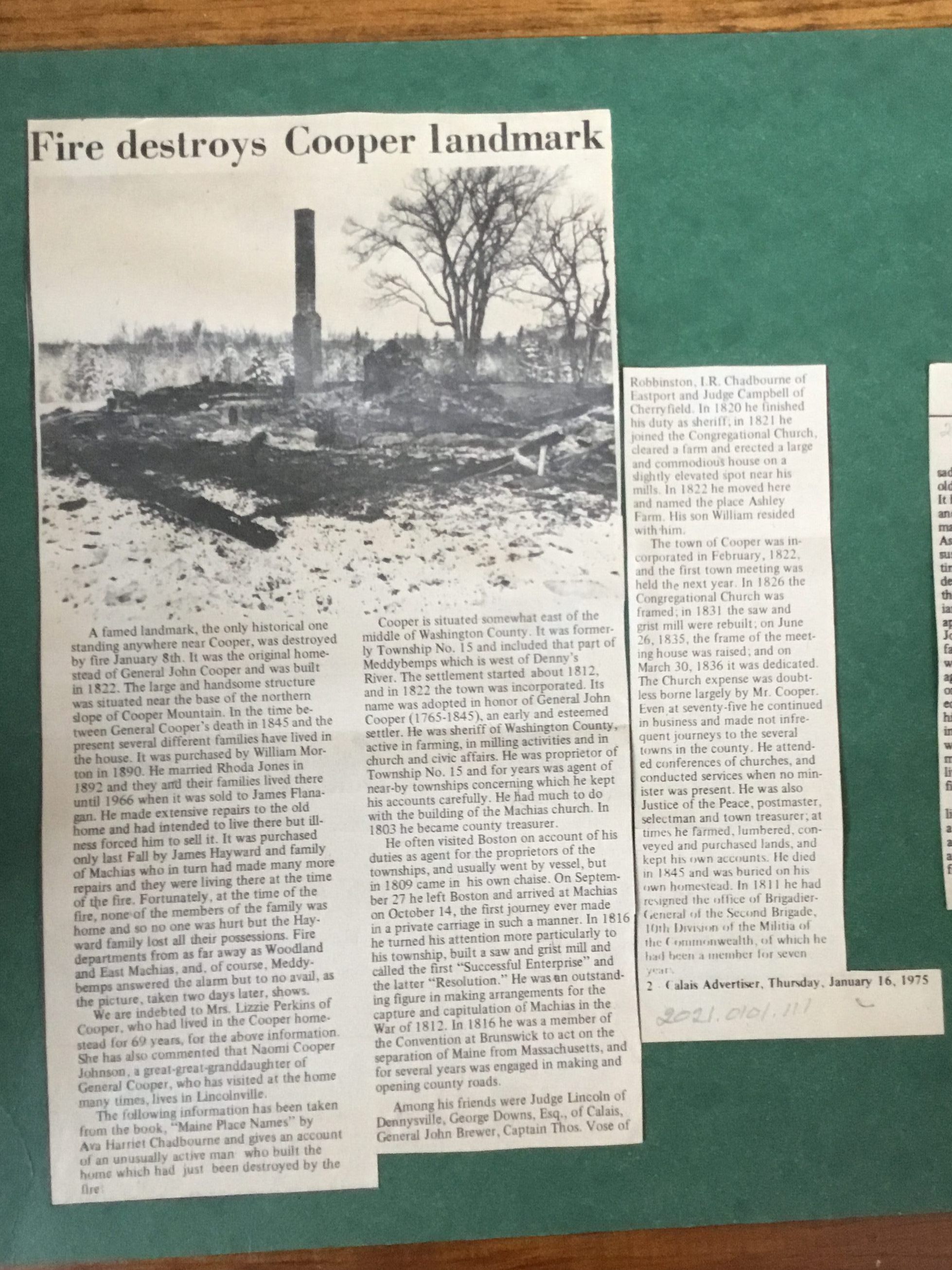 Newspaper clipping from the Calais Advertiser of January 16, 1975 about the history of the home built by General John Cooper in 1822.Collection