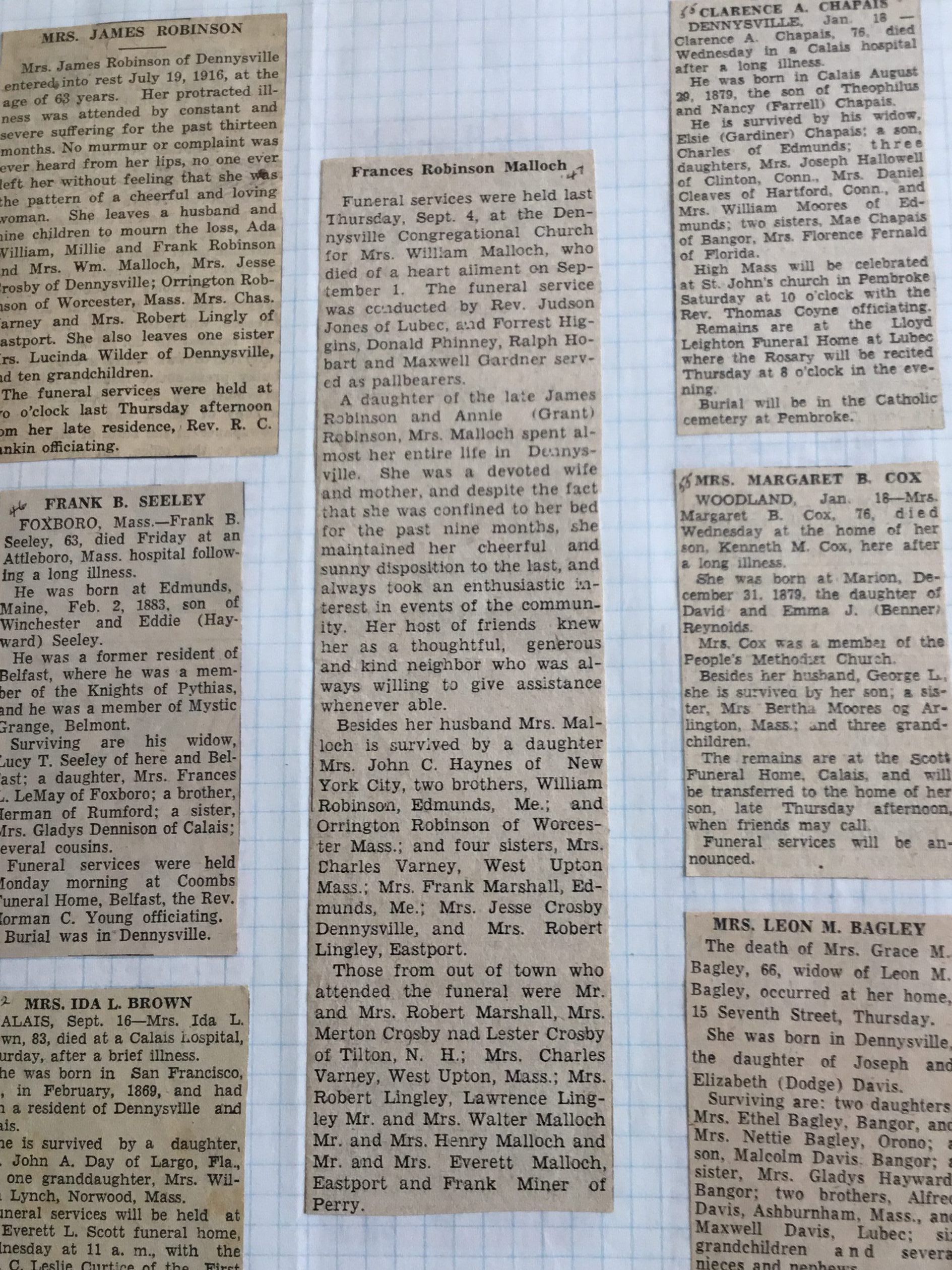 Newspaper obituaries, primarily from Dennysville, Maine, collected and indexed by Edith and Rebecca Hobart.Collection