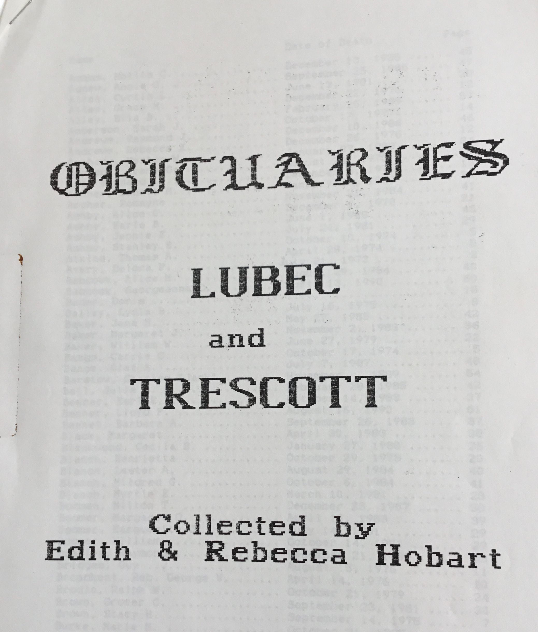 Contains newspaper obituaries from Lubec and Trescott, Maine, with typed and manuscript indexes prepared by the compilers.Collection