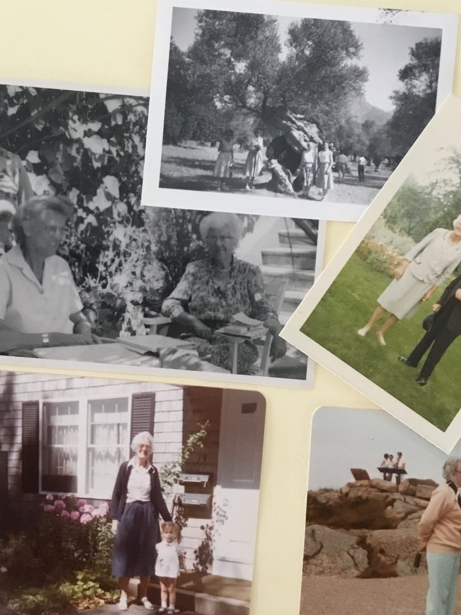 Five snapshots, two black and white and three color, showing Naomi Cooper Johnson with friends. Three items include notes on back of image.Collection