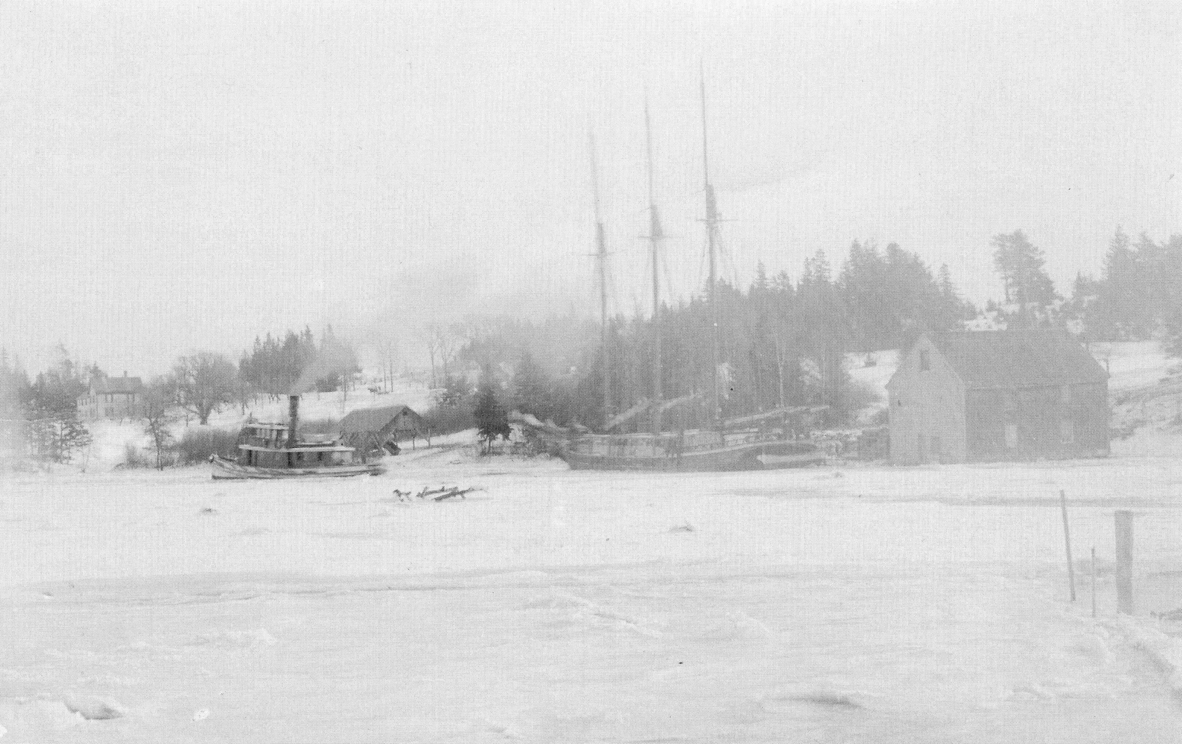The schooner Jennie French frozen in the ice with a deckload of lumber in front of Allen's Wharf on the Edmunds side of the Dennys River, in the 1890's, under tow by an unnamed tug.Photograph Details