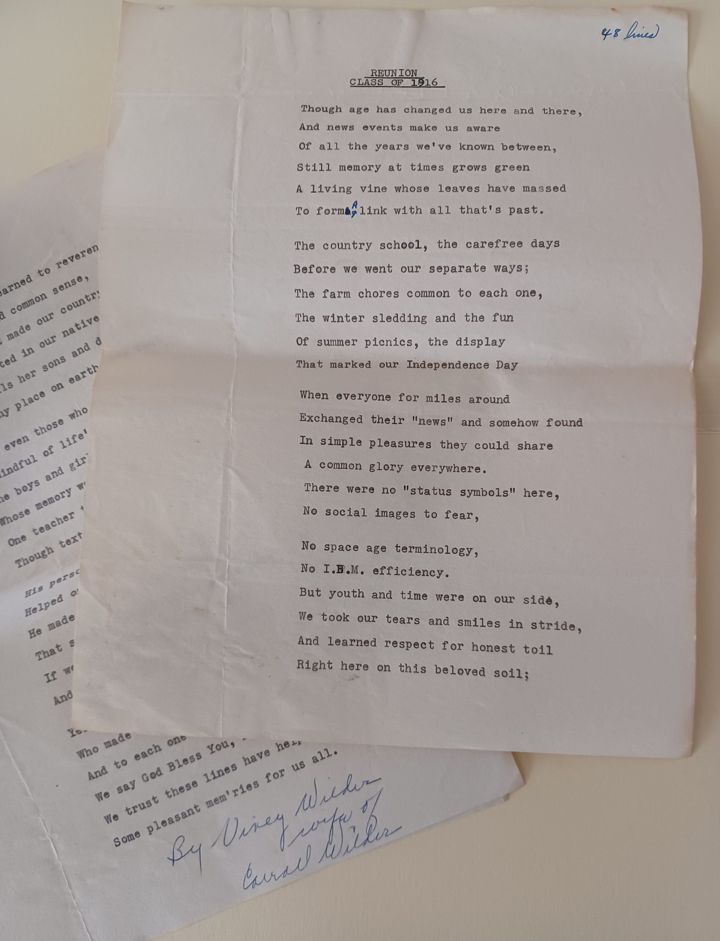 Typescript of poem written by Viney Wilder for the reunion of the Class of 1916 of Dennysville High School. This was probably the 50th reunion, based on references in the poem, and thus have been created in 1966.Collection