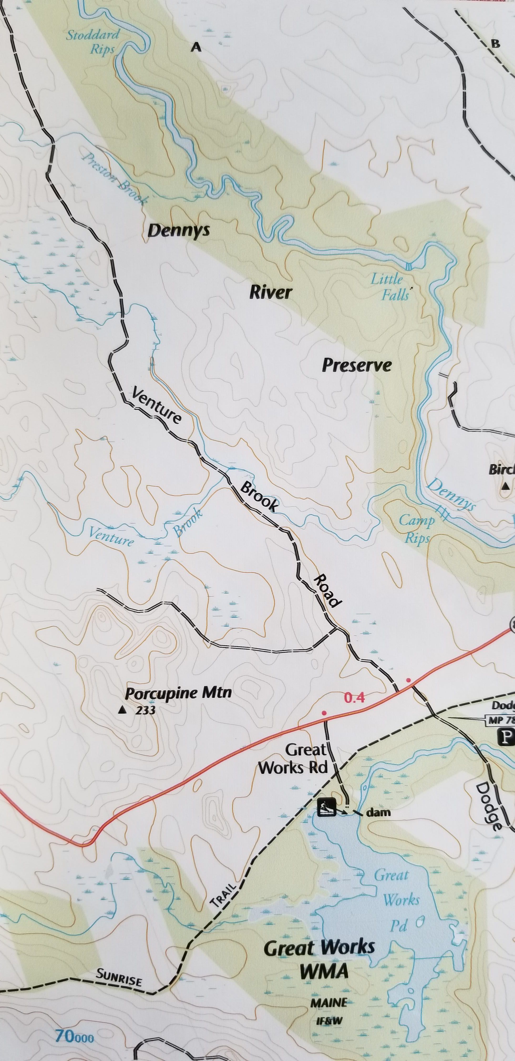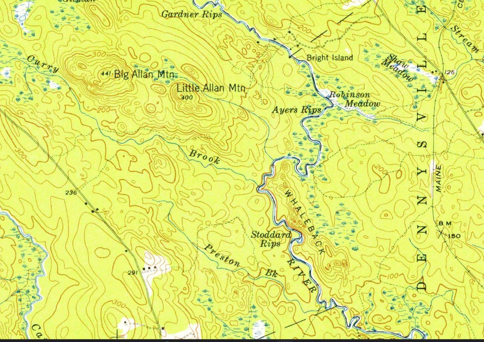 The Preston Brook joins the Dennys River from Cathance Township, where he Whaleback ends below Stoddard Rips.