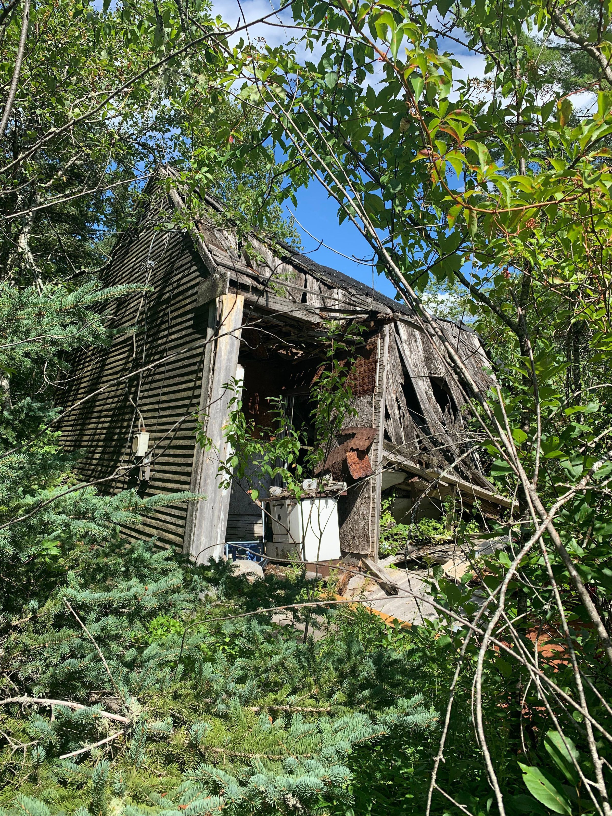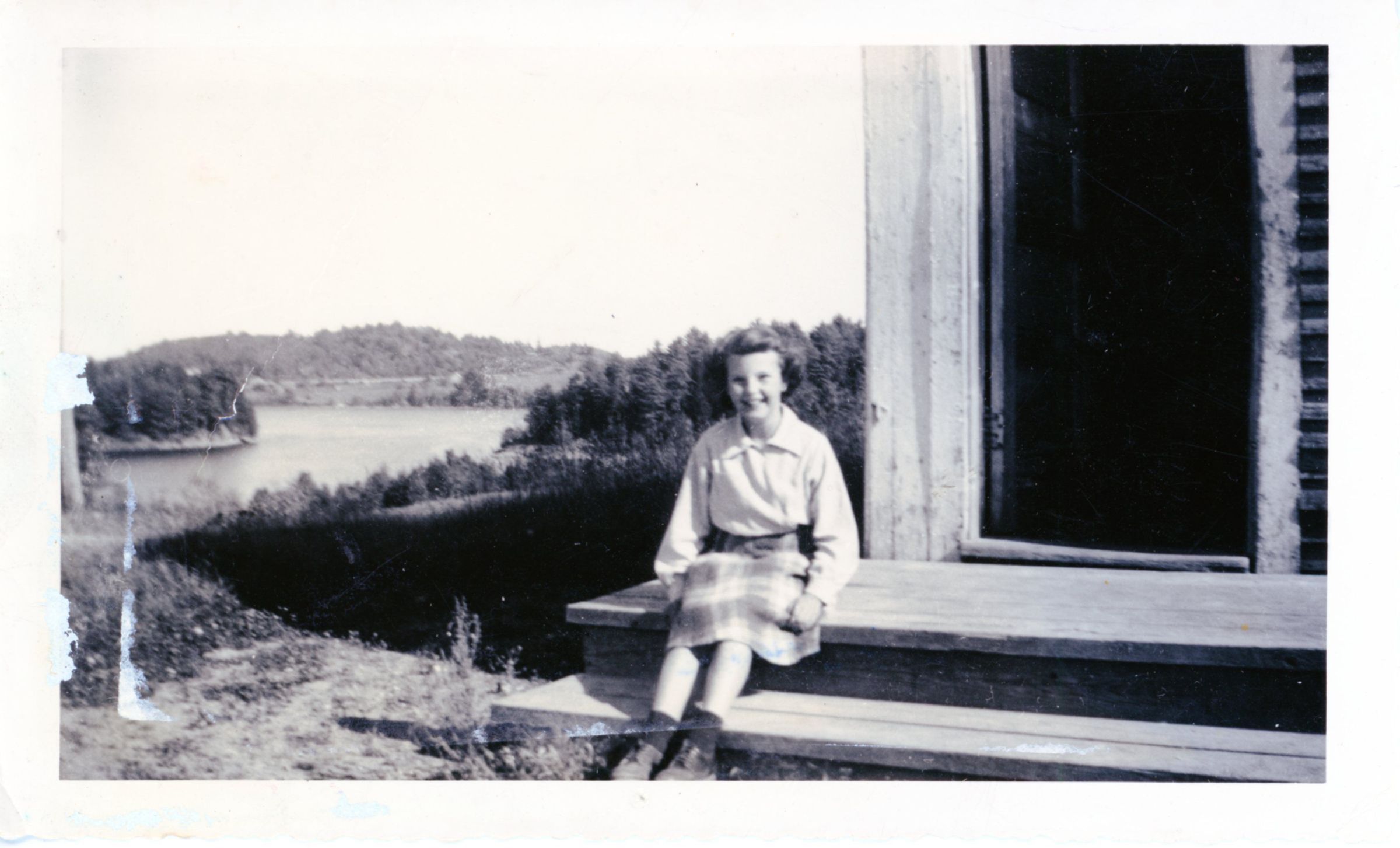 Calista Burr sitting on the steps of the Preston District School House in Edmunds, Maine. The Narrows of the Dennys River is in the background.Context