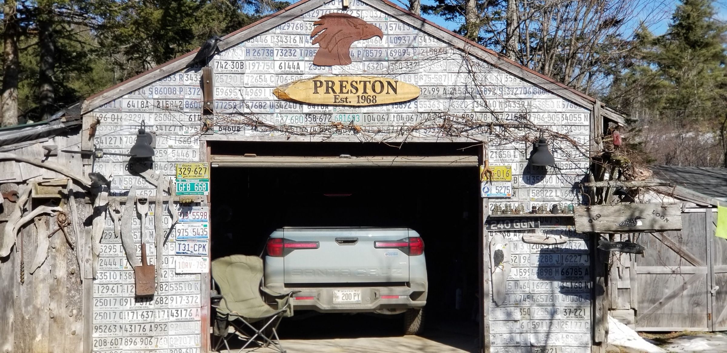 A touch of humor and sense of history combine to establish this well decorated garage on Foster Lane in Dennysville, Maine. Charlie Preston, who assembled the collection of old license plates on this garage, owned and operated Payless Auto car dealership on Route 1 in Dennysville for a number of years.Photograph Details