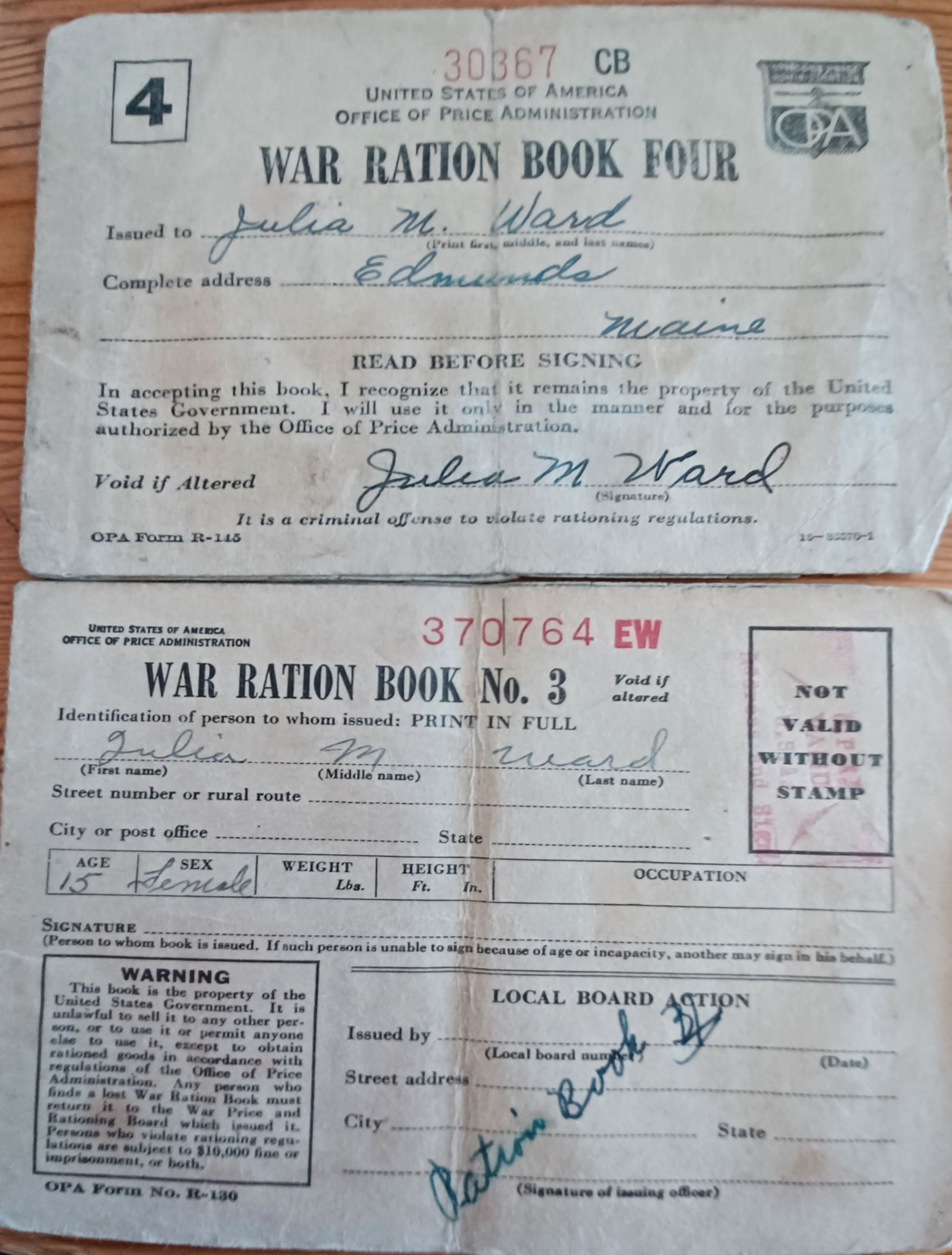 War ration books issued to Julia M. Ward of Edmunds, Maine in 1943, when Julia was 15 years old.Context