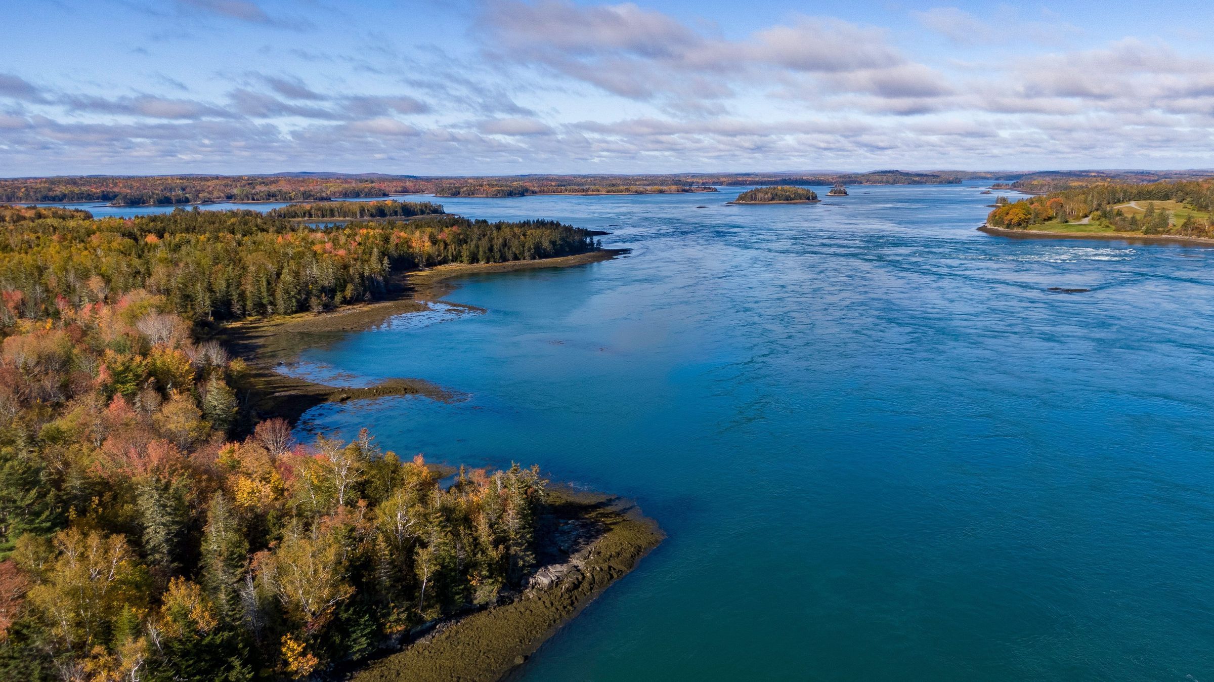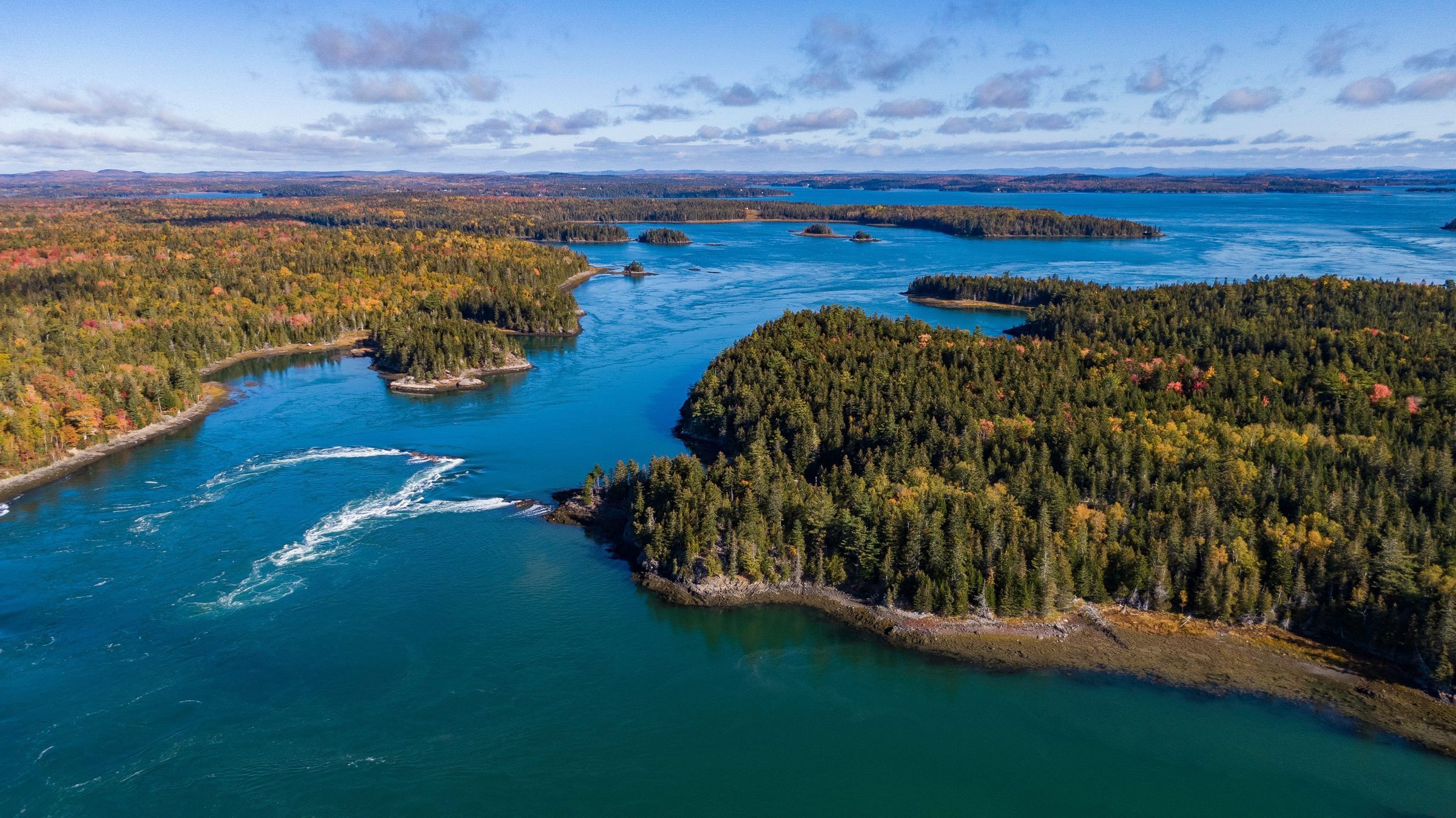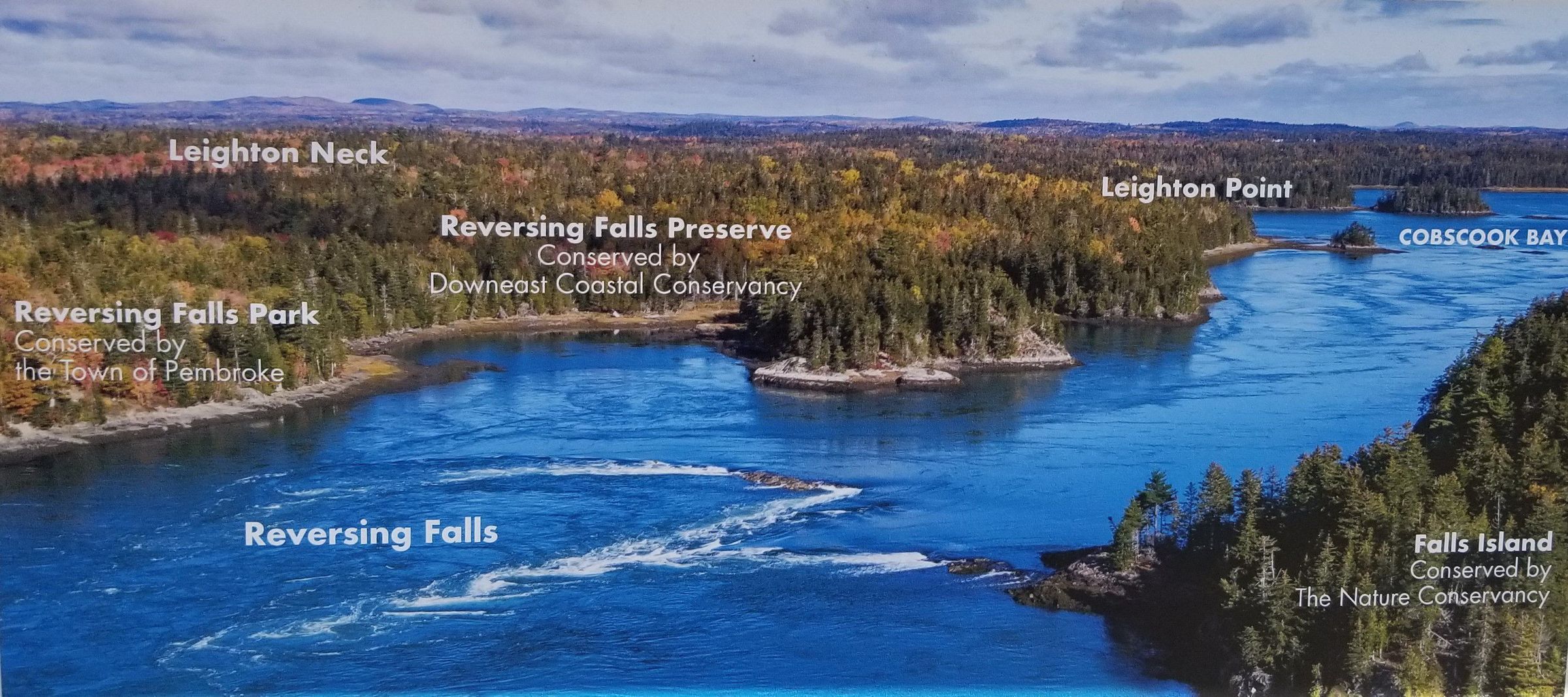 Two aerial view of the Reversing Falls between Leighton's Neck and Falls Island, at the mouth of Dennys Bay, with Long Cove, Schooner Cove and Mahar's and Leighton's Points, and Cobscook Bay beyond.