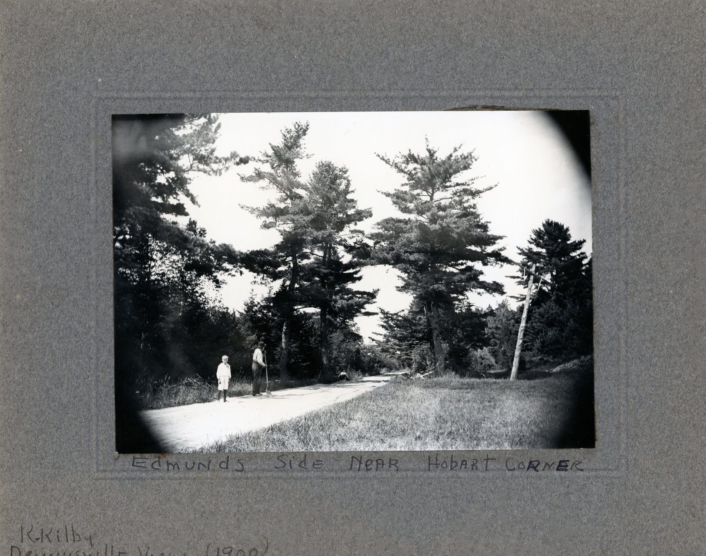 A view of the River Road in front of the house of John P. Sheahan, in Edmunds, Maine. A child is standing near several men working on the road. Photo courtesy of The Tides Institute, Eastport, Maine, with a caption by Keith Kilby.Collection