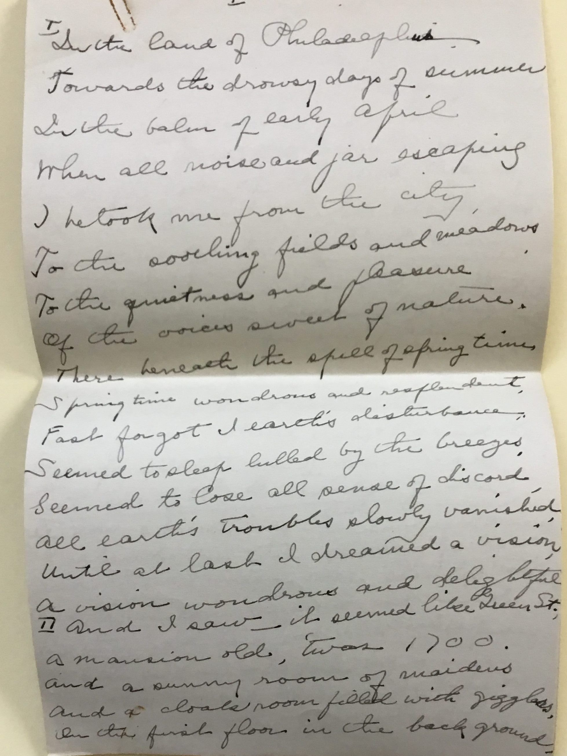 This appears to be a script for a school presentation. Written in pencil, it tells a story about a young women who talks in verse about life in a Philadelphia girl’s school in 1700. The document is divided into sections, and at the end the presenter of each section is named.Collection