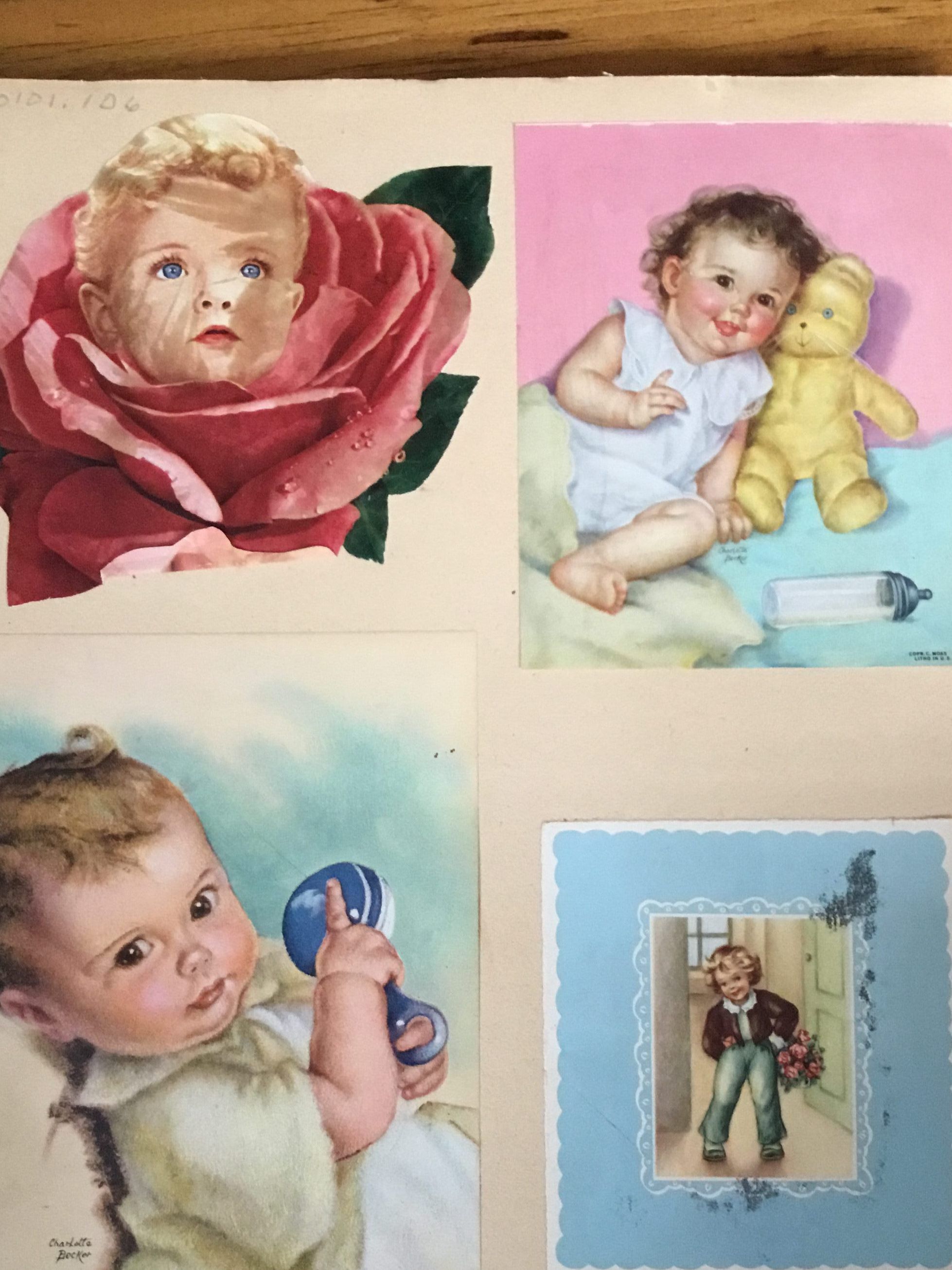 Scrapbook containing pictures from greeting cards, calendars, and magazines. The subjects include images of children, animals, flowers, outdoor scenes, and household scenes.Collection