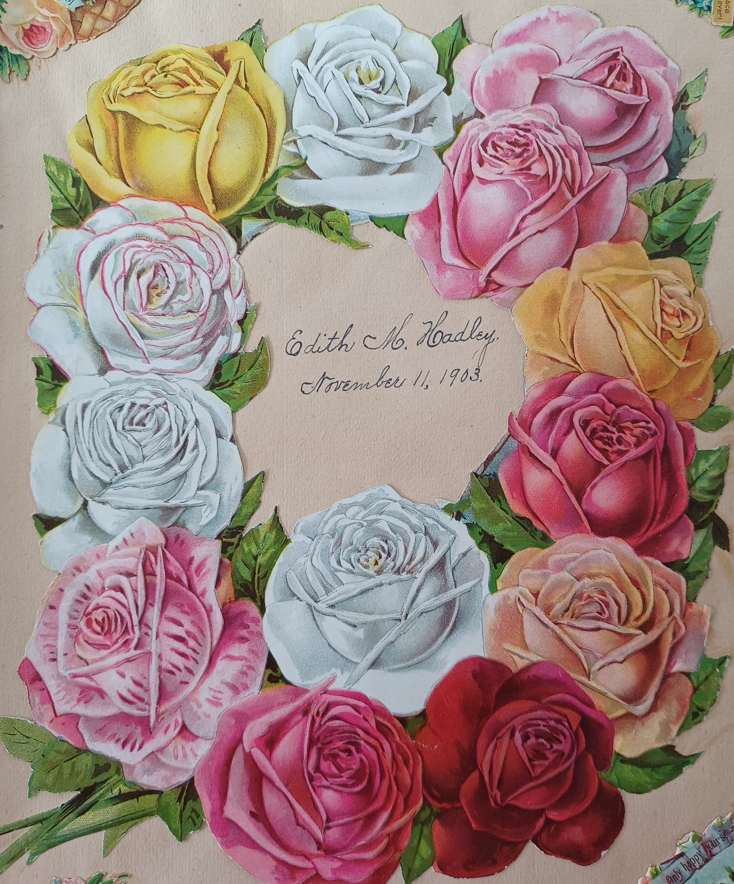 A 36-page scrapbook with images of fashion, flowers, animals, children, and food with a date of 1903.Context