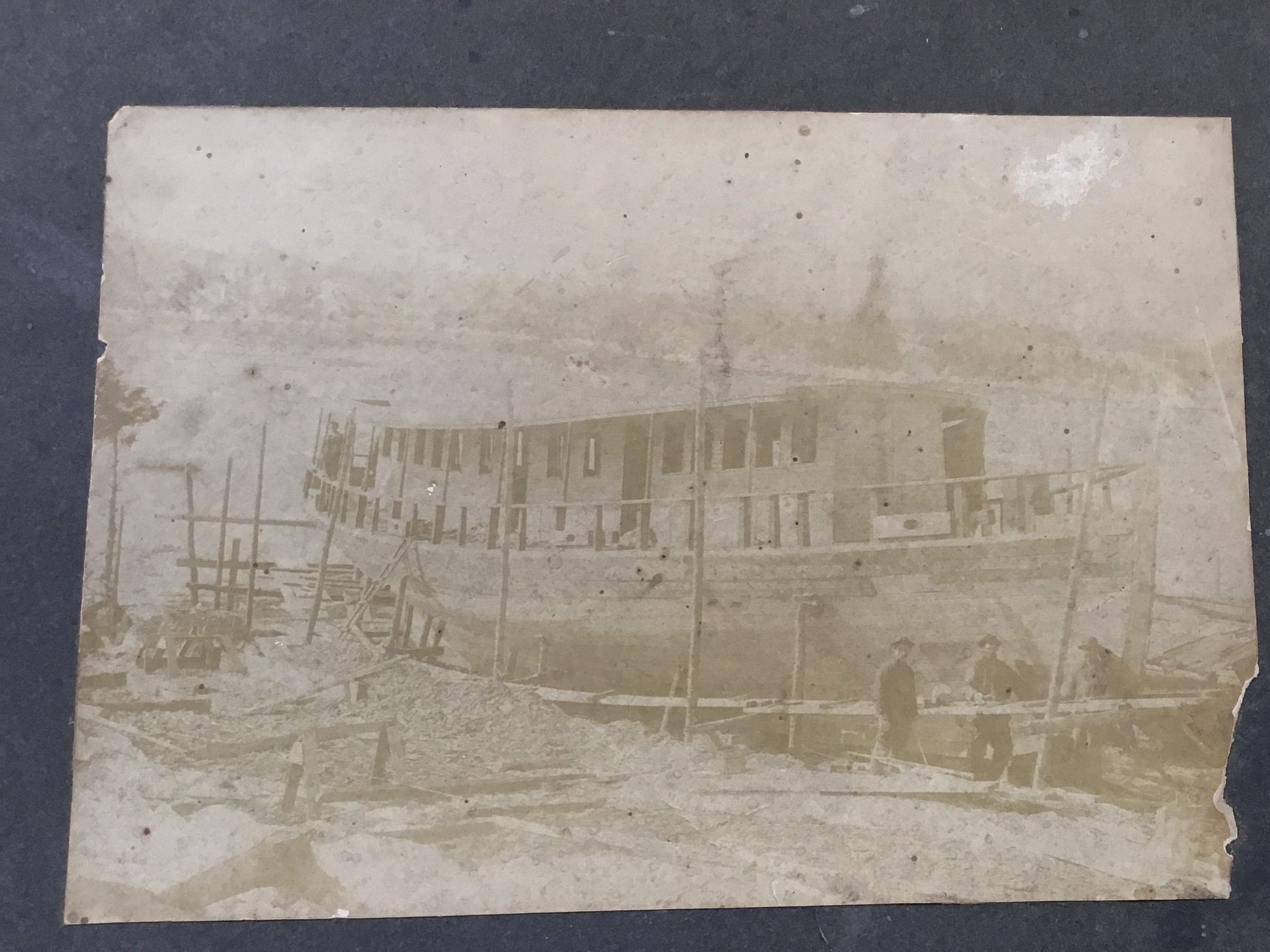 Matted photos, circa 1880, of a small ship under construction and workers, location unknown. Also includes image of a steam locomotive and tender, location unknown.Collection