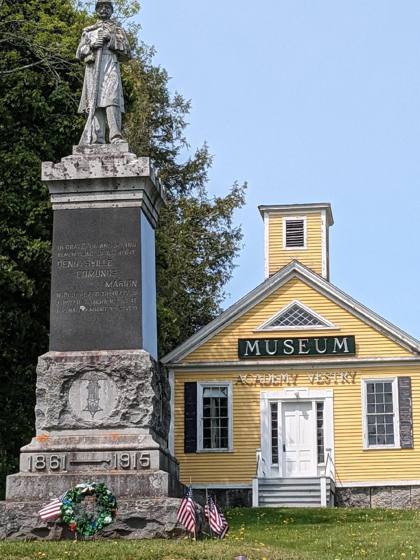 This soldier's monument was erected in 1915, and is dedicated to American soldiers from Dennysville, Edmunds and Marion. It has been the scene of Memorial Day observances through the years, where Lincoln's Gettysburg Address is read annually along with the names of all those who served in the Civil War.Context
