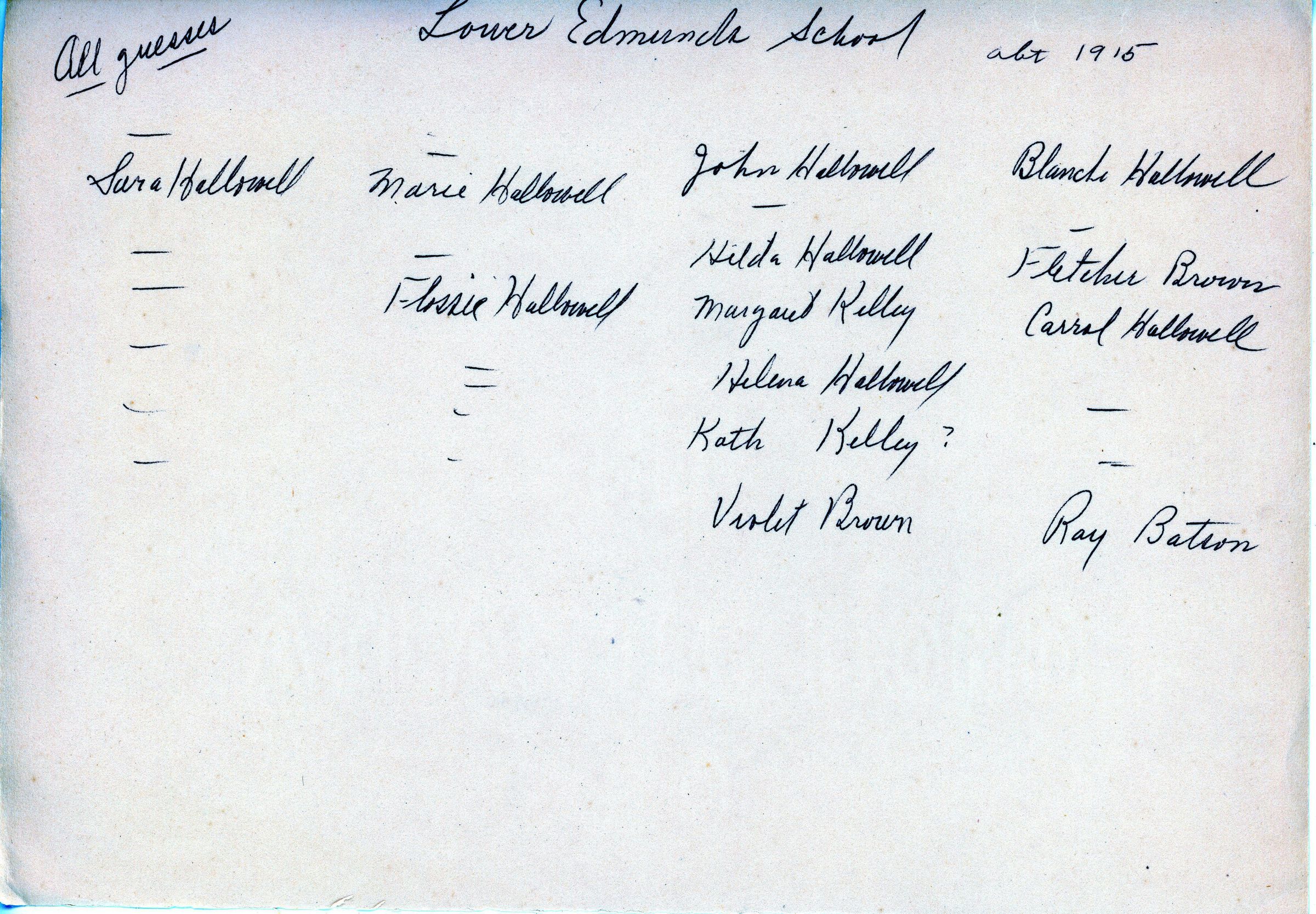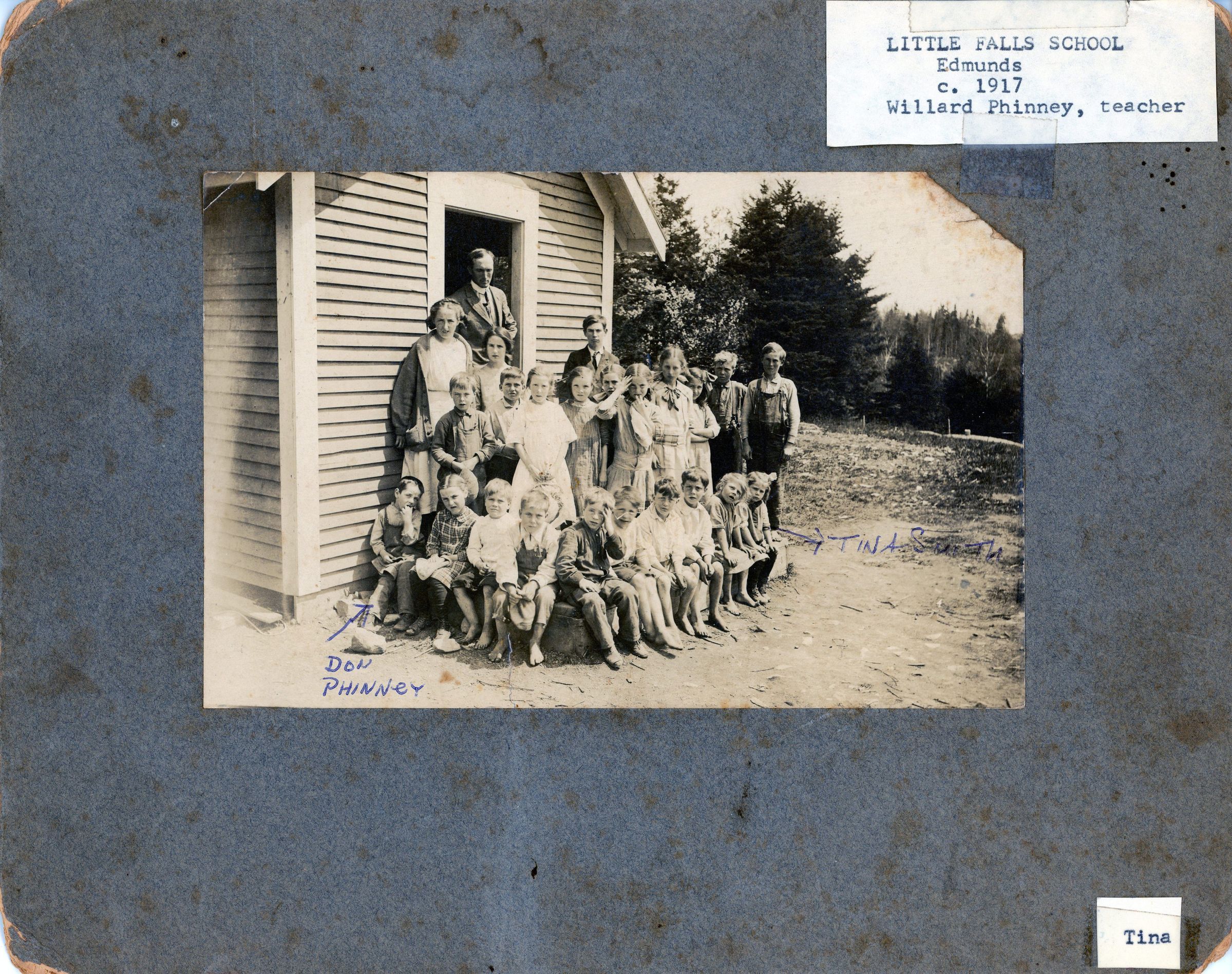 South Edmunds School, also called the Hallowell District School. Lower Edmunds (formerly called the Shore Road), with Willard Phinney, teacher, c. 1915. The label on this photo incorrectly names the school as Little Falls School, which was located elsewhere. The teacher, students and schoolhouse were all on the South Edmunds Road.Context