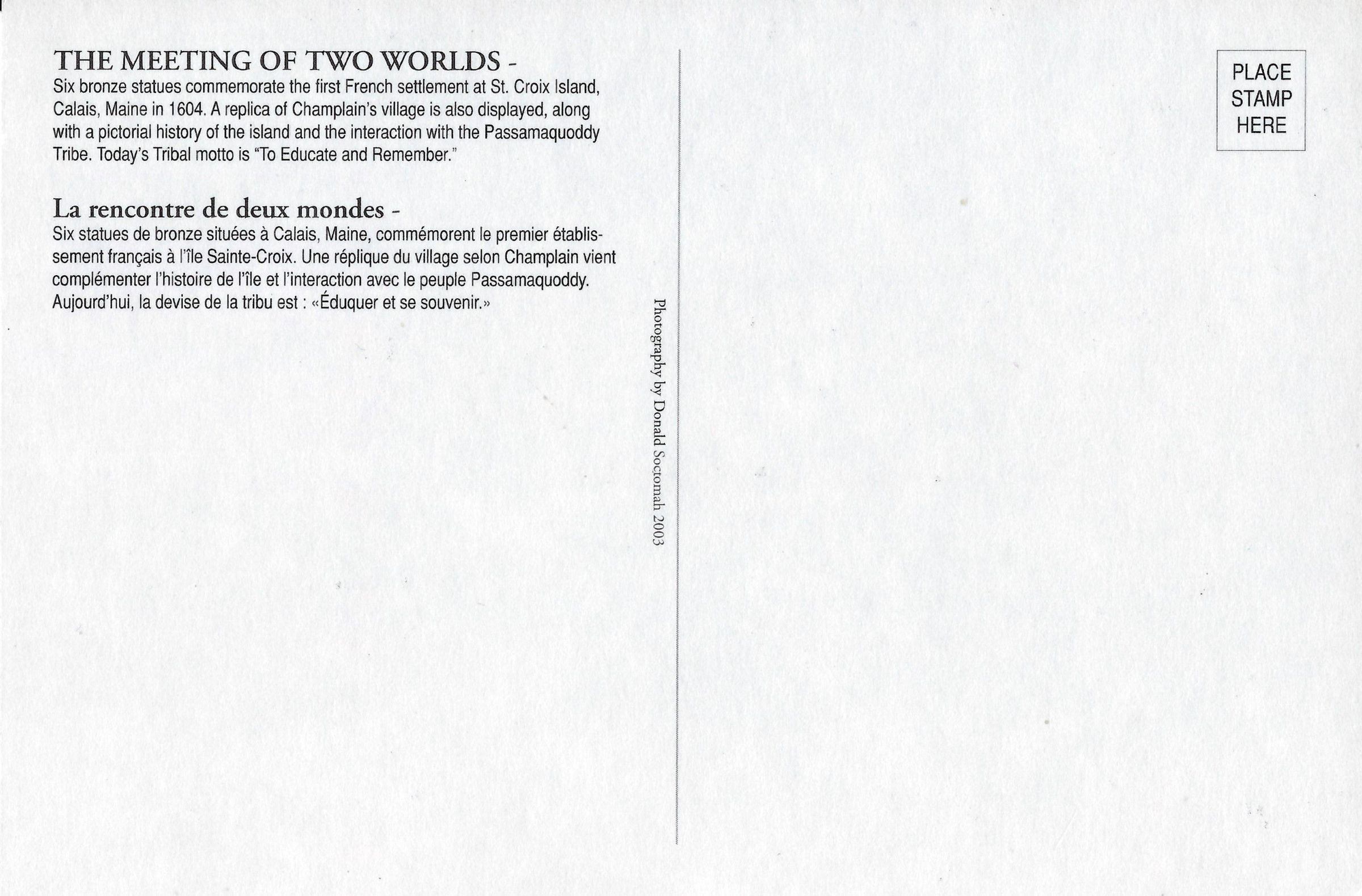 Postcard image of six bronze statues installed at the Saint Croix Island National Historic Site depicting French sailors and Wabanaki Indians, entitled "A Meeting of Two Worlds.", and verso image text.Collection