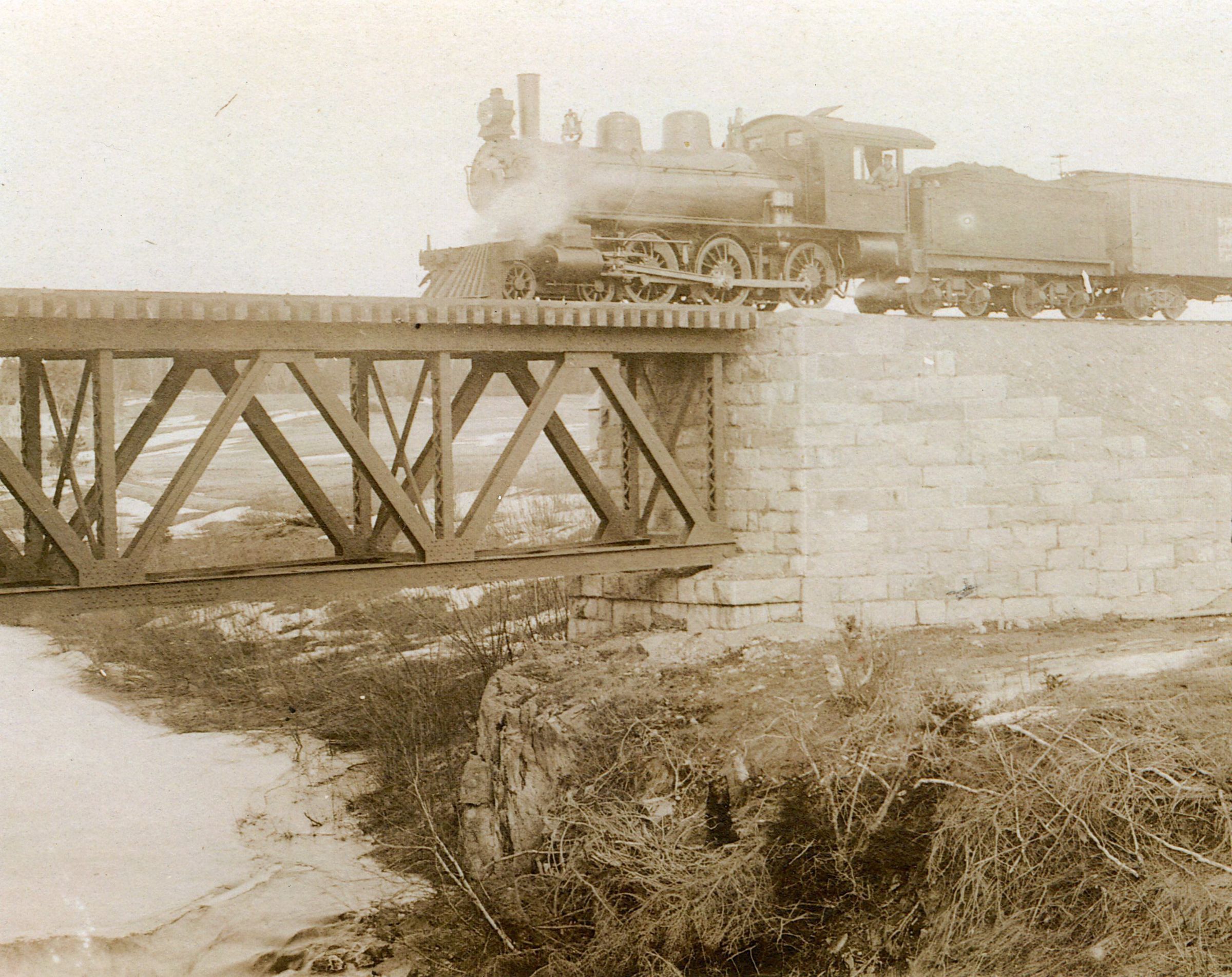 During June 1896, a railroad contractor was in Dennysville getting rights of way for the railroad through town, but the actual clearing of the land did not start until November, 1897. In December of that year a contractor, Wheaton, brought his crew to work a cut for the railroad near Falls Bridge. They rented the nearby Charles Wilder house, and worked through the winter months, even when the temperature was -34 degrees on January 31, 1898. In April, John Boyd of Calais brought a crew to build the stone abutments for the railroad bridge. The granite, which was brought by the schooner Rocky Mountain, kept most of the teams in town busy transporting it from Allan's wharf to the Falls. By June there were other crews at work, Joe Orlando's at Stoddard Meadow and McLaughlin's at Shaw Meadow. On June 30, 1898, the townspeople heard the engine whistle blow for the first time. Although the iron bridge was not yet constructed, the first engine, No. 4, crossed the river on a false structure on August 27, 1898. During September, the construction train was laying ties and rails between the Falls and Great Works and a steam shovel was at work on the gravel hill by the Falls. On January 2, 1899, the trains began running on a regular schedule. Two days later the first car of corn to be hauled by the Washington County Railroad came into Dennysville for the A.L.R. Gardner Company.Collection