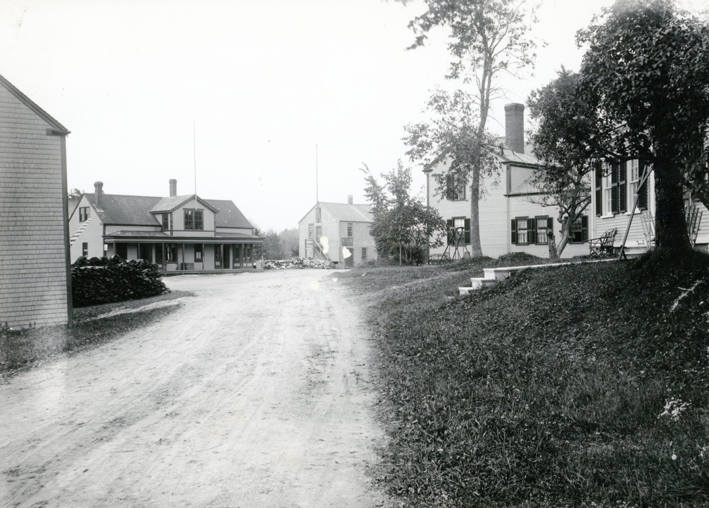 View of Store Hill after 1909. Vose's Store and G. A. R. Hall are on the far side of Water Street, Howard Laughton's barber shop on left, and Benjamin Foster's and Will Allan's houses are on the right.Context