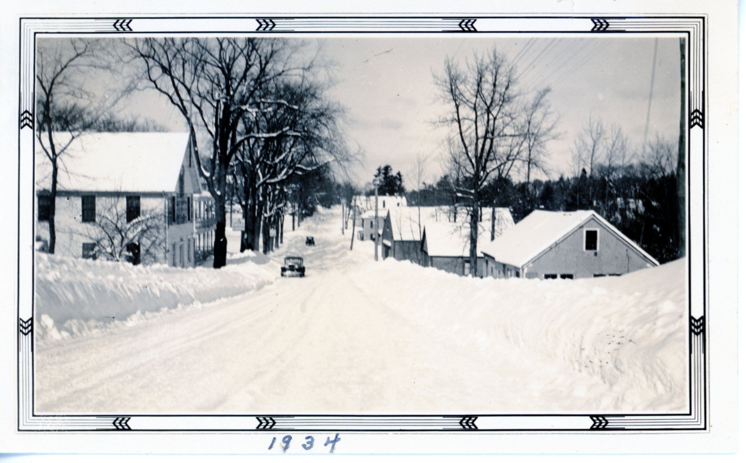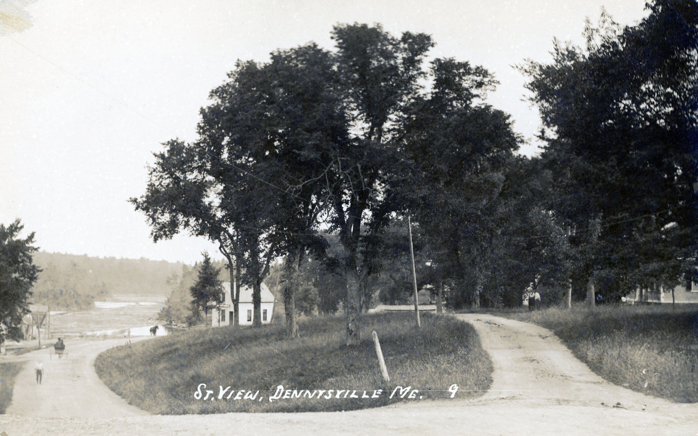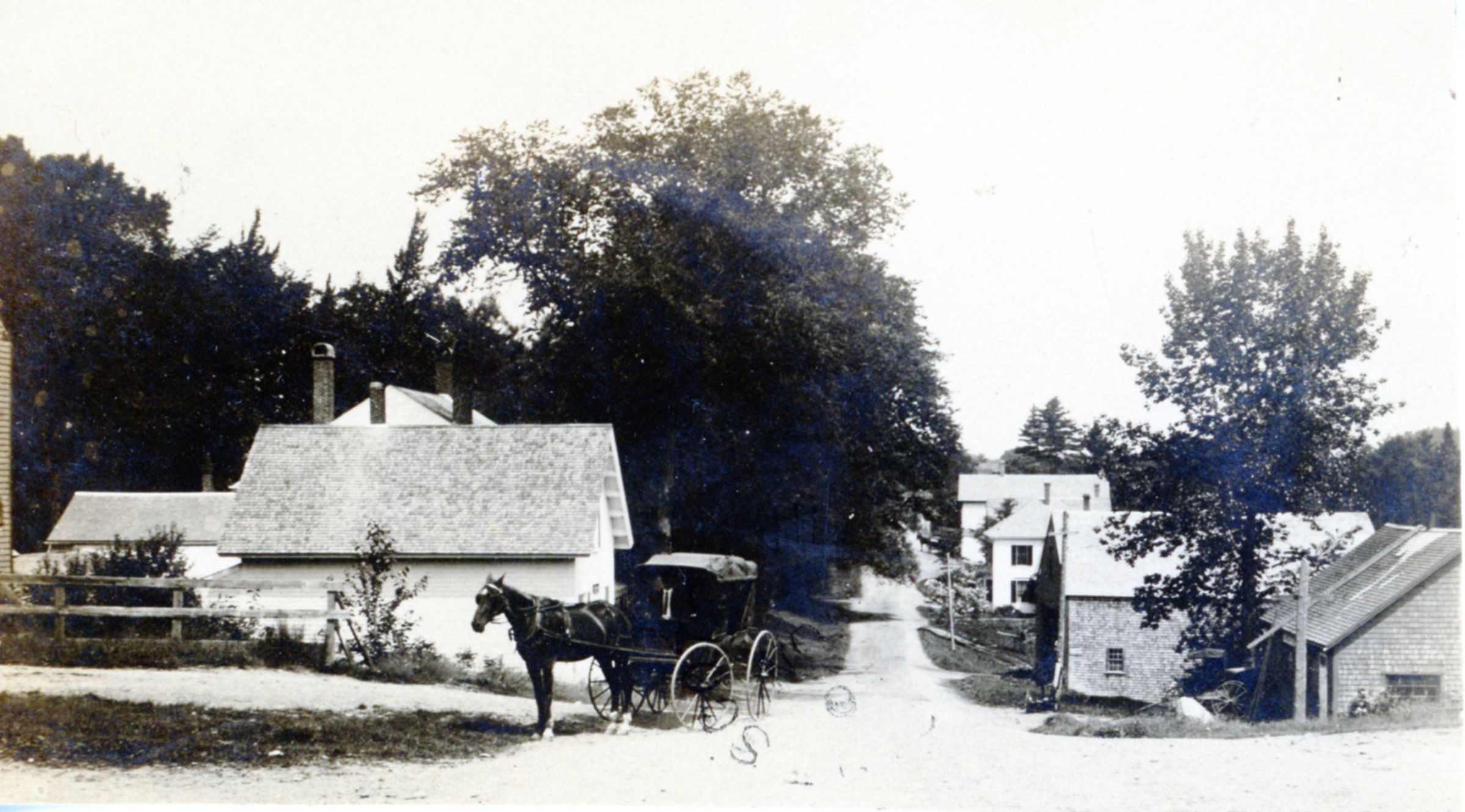 Looking down hill from roughly in front of the Kilby-Vose store. At the left is the building which became the Gardner-Foss American Legion Post and the roof of the Riverside Inn. At the bottom of the hill is the Kilby's store, beyond which is the Walter Dodge store. The mail carrier's buggy is in the foreground.Context