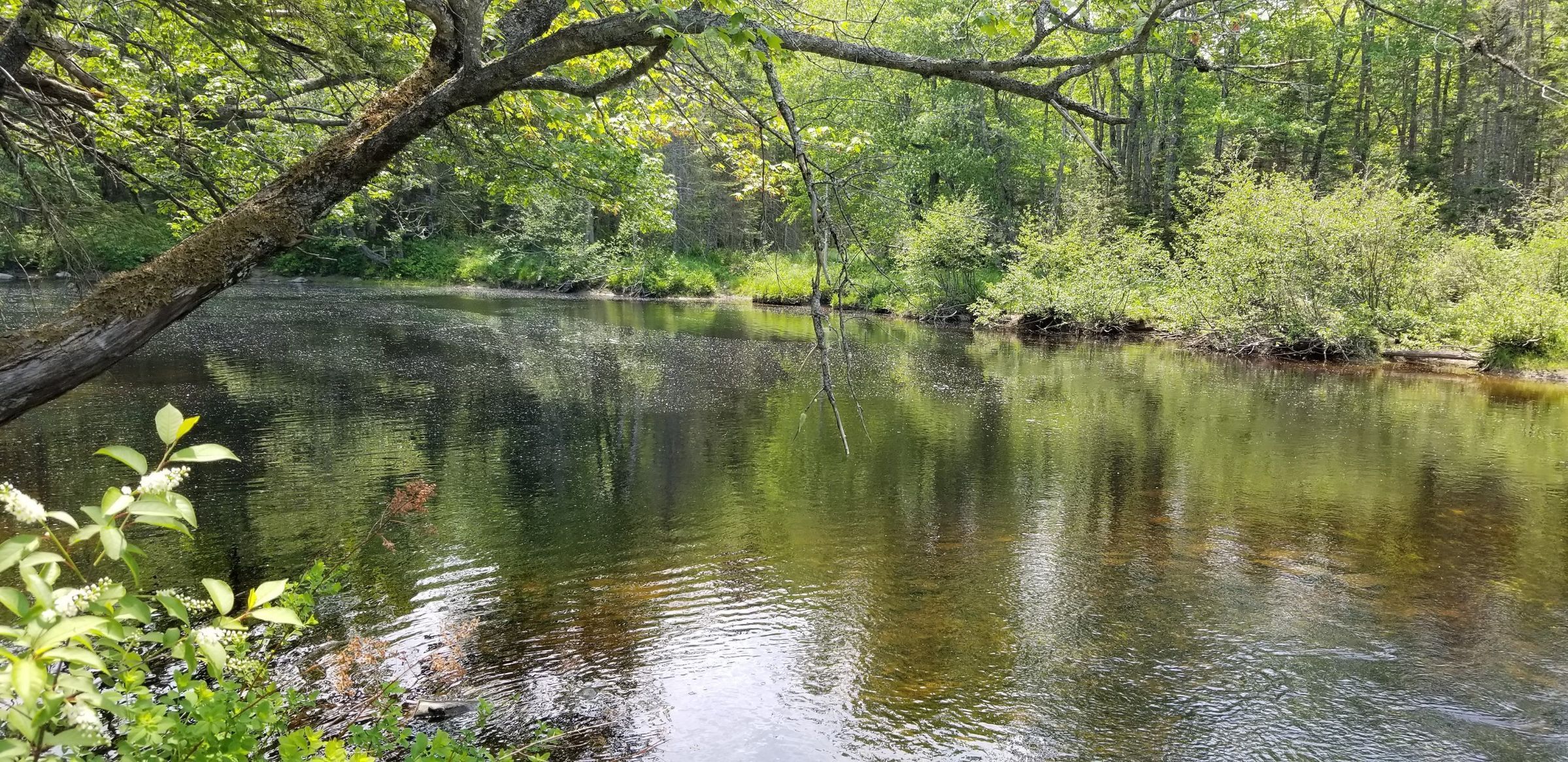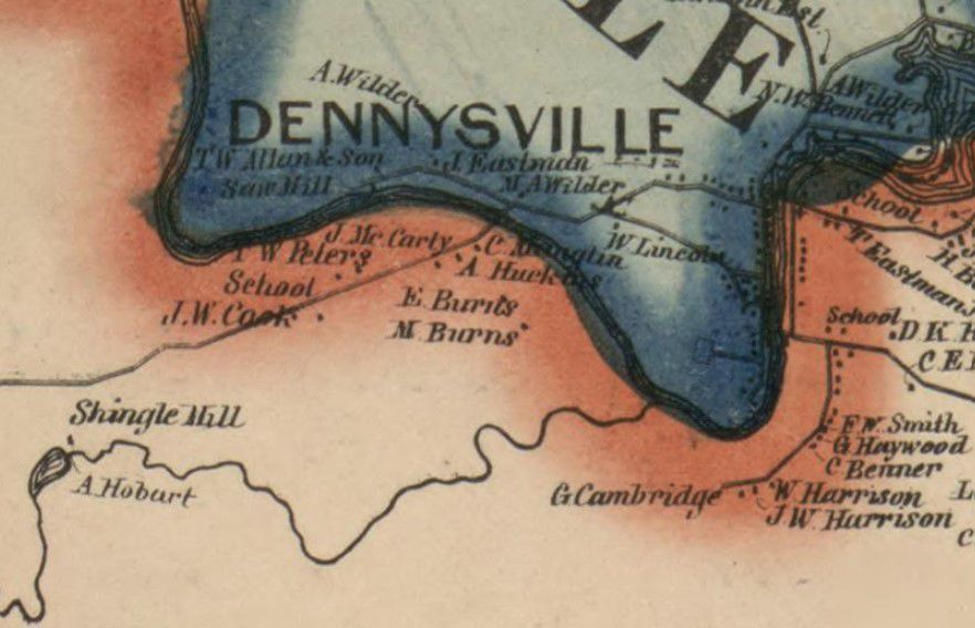 The Mill Seat Pool on the Dennys River is situated where the former T.W. Allan and Son sawmill stood beside the Milwaukee Road in Dennysville, Maine, in the nineteenth century. Maps of Dennysville in 1861 and 1881 identify several sites of T.W. Allan's lumbering operations. Sunken logs and a quiet flow are mute witness to the activity that once happened here.Context