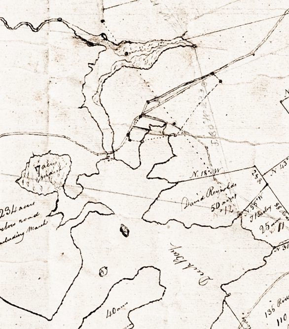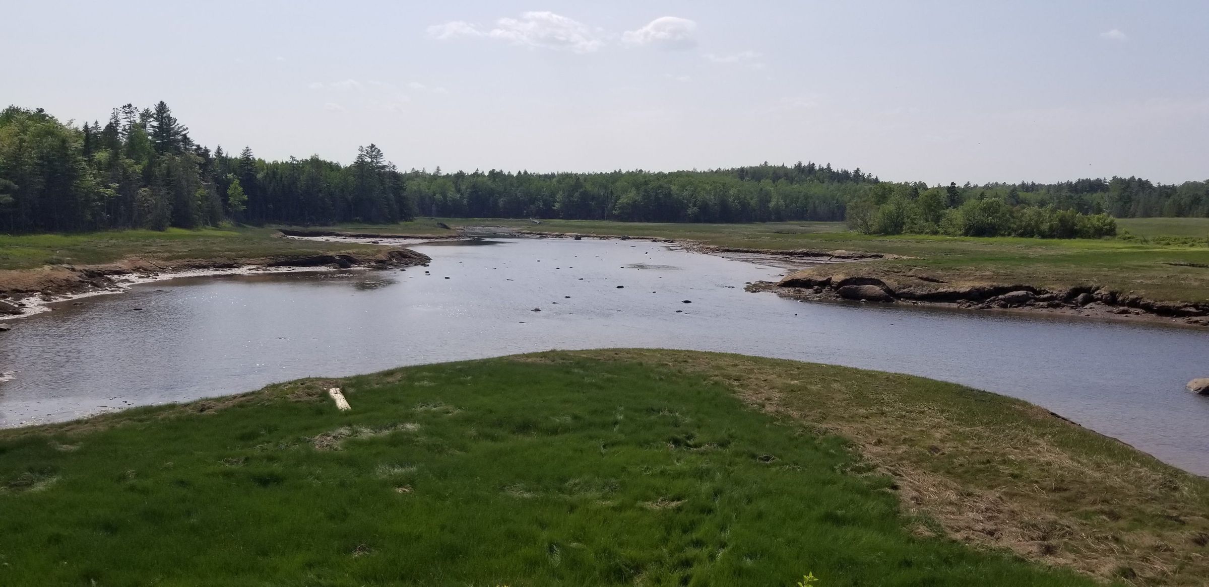 View of the tidal marsh on Hobart Stream, sometimes called "the Mash", where salt hay was harvested from the earliest settlement of the area. The remains of dykes along the western side of the stream, on the right side of the picture, are still visible at low tide.