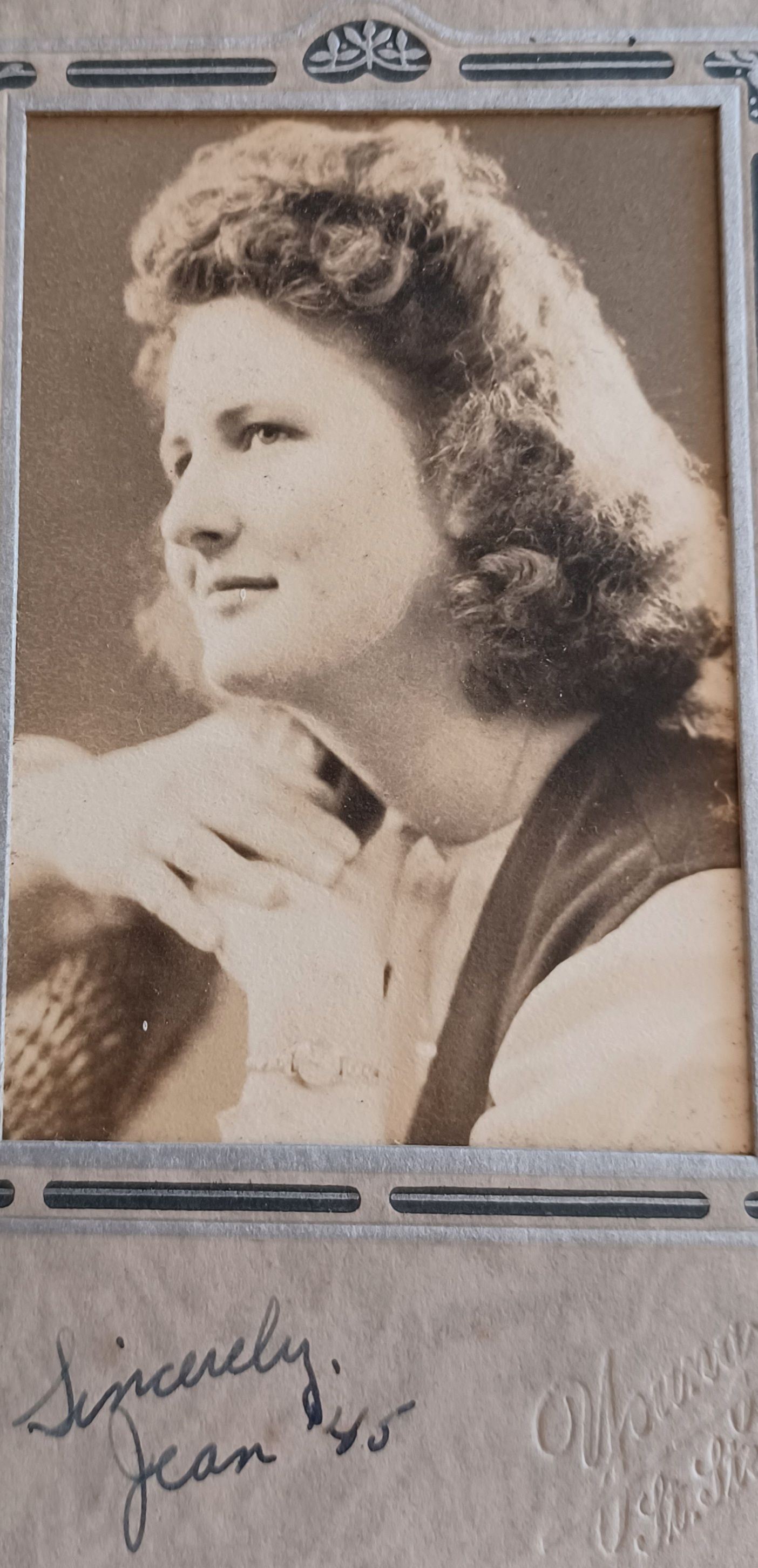 Two photos of young women. One is identified only as Jean ["Sincerely, Jean '45"]. The other is a photo of of Alice Gilpatrick. Both photographs appear to be graduation photos. The photograph of Jean appears to have been taken by a photographer in St. Stephen, N.B.Made/Created