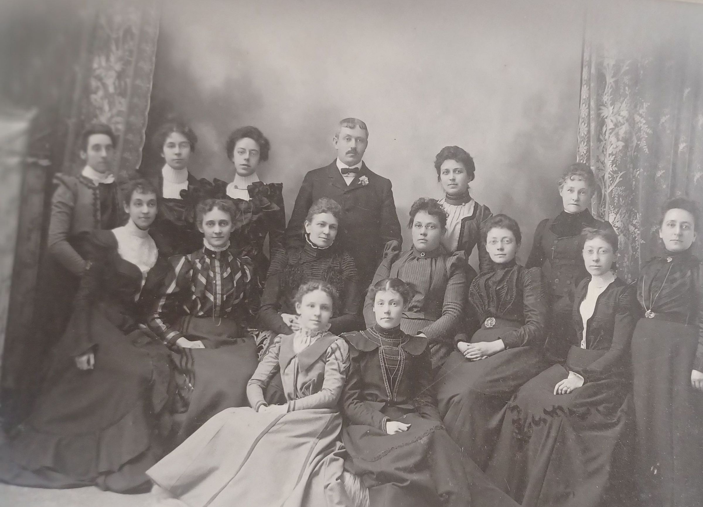 Group of 14 women and one man, possibly the teachers and principal of a school.