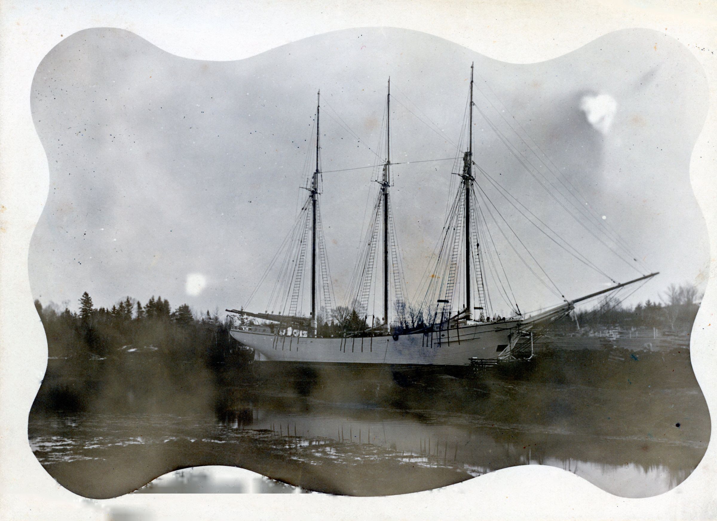 This three-masted schooner appears to be under repair somewhere in the Cobscook Bay area. Photo courtesy of The Tides Institute, Eastport, Maine.Collection