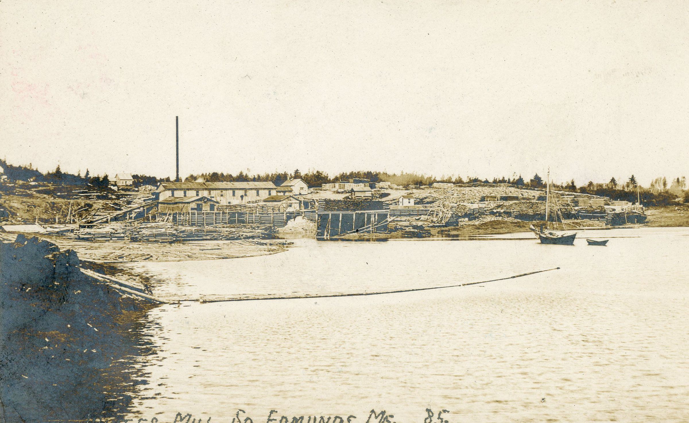 Postcard showing White's MIll in South Edmunds, Maine, with sloop and dory.