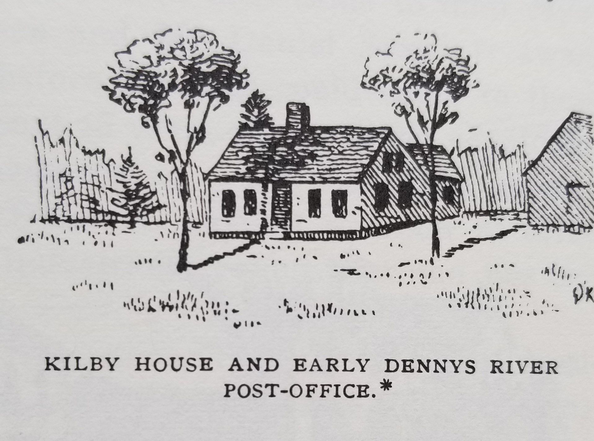 Sketch of William Kilby's House in Dennysville, Maine, completed in 1790. It also served as the Store and first Post Office in the community, after his appointment as Postmaster in 1800. This drawing was printed in "Eastport and Passamaquoddy" by William Henry Kilby, published in 1888, on page 335. The asterisk refers to footnote, appended below. The house itself was sold after his death in 1829 and moved across the Dennys River to a new location to the opposite bank in Edmunds, Maine.Context