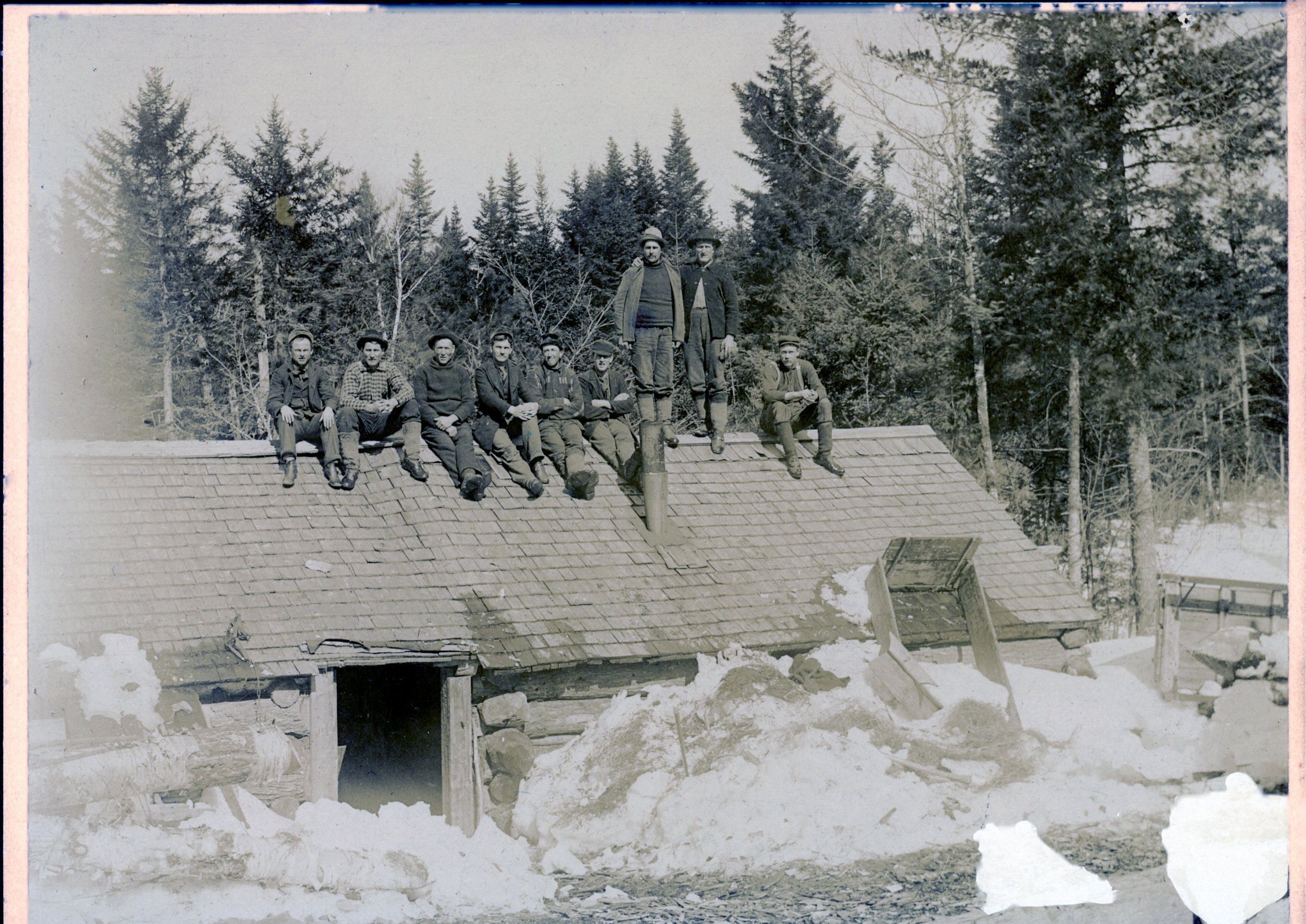 Woods camp and crew sitting on the roof during a winter in the woods.