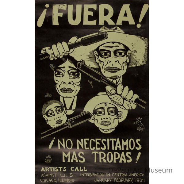 Carlos Cortez, a prolific Chicago printmaker, continued the political and cultural work of his immigrant parents by creating woodcut prints for the Industrial Workers of the World, an international labor union founded in Chicago in 1905 to which Cortez himself belonged for nearly 60 years. The first print, a poster for a 1984 show as part of the Chicago’s Artists Call Against U.S. Intervention in Central America and the Caribbean, depicts four figures protesting against the arrival of American troops in their home countries. The second, made for the Chicago Mural Group — a collective founded in 1971 and responsible for hundreds of public artworks across the city — shows a woman painting a mural wherein the proximity between the muralist’s brush and the bayonet clutched by one of the figures in the background suggests the potency of art as a political weapon.