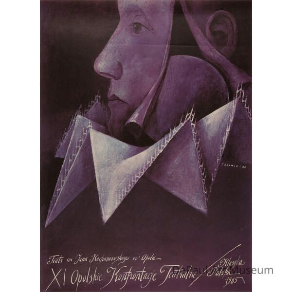 This is a Polish poster advertising the 11th Polish Theatral Conference in 1984. Made up of purple hues, the composition consists of the side profile of a man which looks like it is split and curling like paper. Inside the slit is a sphere. The face is wearing a white, jester-like spiky collar. The inscriptions lay at the bottom of the poster, with the theater name (Teatr im Jana Kochanowskiego w Opolu) above the conference name (XI Opolskie Konfrontacje Teatralne). Theater poster.Context