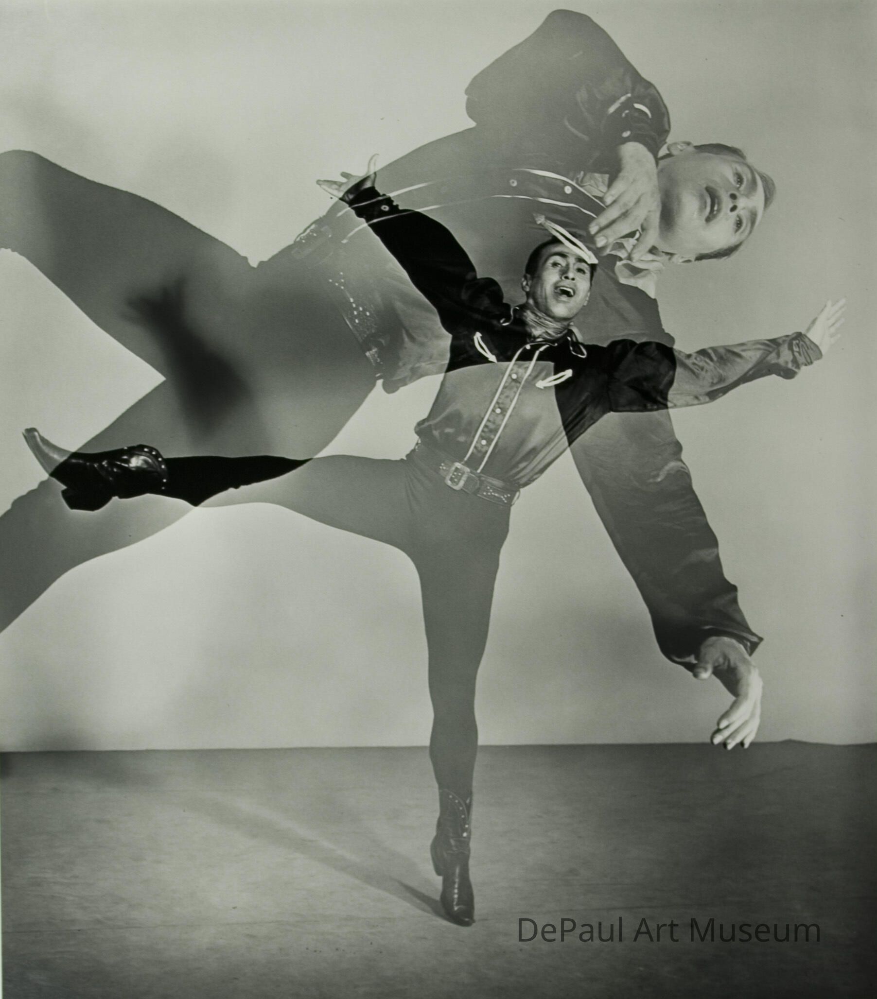 Double exposure photograph of José Limón dancing with arms and legs outstretched.Context