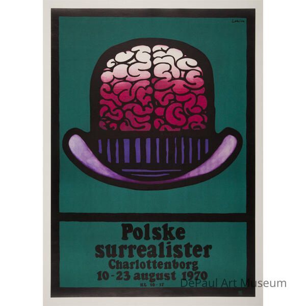 large pink brain within hat on green background - black text reading "Polske Surrealister, Charlotenborg 10-23 August 1970" at bottom