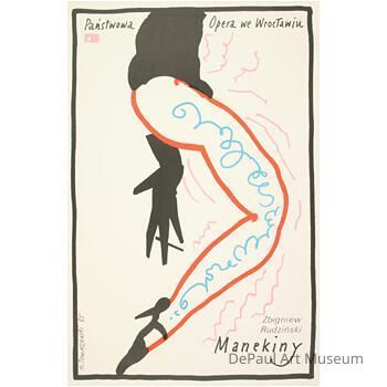side view of woman's leg and hand holding cigarette (rendered in countour lines and simple shapes). Text reads "Pantswowa Opera we Wroctawin" and "Zbigniew Rudzinski, Manekiny"