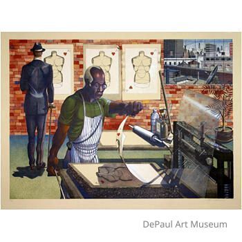 "Blackburn" is a print Adams created as a tribute to his friend and colleague, fellow printmaker Bob Blackburn (1920-2003). Adams first became aware of Blackburn?s work while working at Gemini.  Eventually they met and established a lasting friendship.  Adams was inspired to create this homage because, as he says, there are ?very few black professional lithographers? and because Blackburn was a ?leader in the field.? The piece also stands as a larger tribute to those who work behind the scenes to edition prints and are seldom recognized for their contributions to the final work.Artwork Details