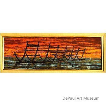 Horizontal, barren landscape scene with fiery red sky and blue-green ground. A row of sharp, uniform forms resembling chairs stretch across the image.